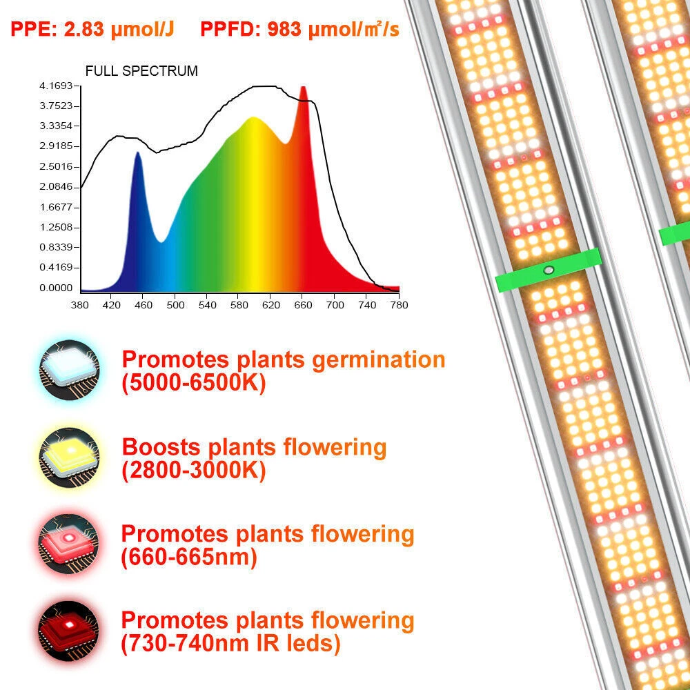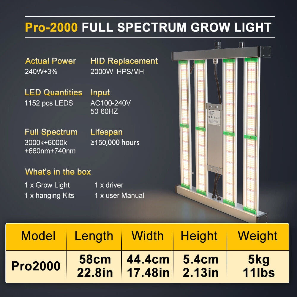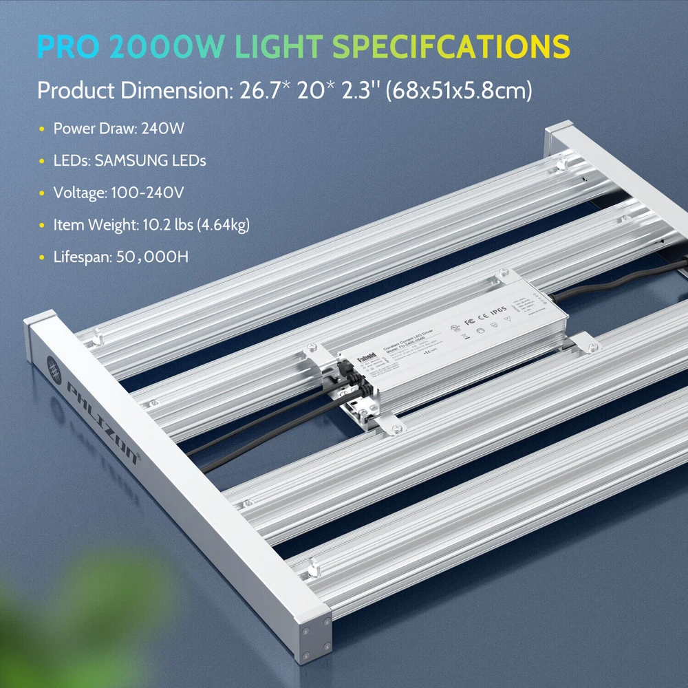 Dimmable knob can adjust the light intensity, to meet different lighting requirement from seeding, veg to flowering and fruiting. Protective glue on lamp surface around LEDs, makes the light water proof while retains LED original high lighting emission. The water proof feature aids in keeping the lady bugs out of the light fixture. Phlizon 2000W Pro LED Commercial Grow Light Full Spectrum for Indoor 4x4ft Tent Premium Quality Low Maintenance Dimmable knob can adjust the light intensity, to meet different lighting requirement from seeding, veg to flowering and fruiting. Protective glue on lamp surface around LEDs, makes the light water proof while retains LED original high lighting emission. The water proof feature aids in keeping the lady bugs out of the light fixture. About this item EXTREMELY LARGE GROW AREA- Compared with other grow light, the outstanding feature of this lamp is that it has a larger irradiation area. This is not only due to SMD lamp beads, but also because of its special appearance design. It contains 1152 pcs led beads and itself has a large area . The all-aluminum alloy design also makes it lighter and easy to use. LESS ENERGY, MORE YIELDS - Built with high performance LEDs and reliable driver, Phlizon LED grow light offers high energy efficiency at 2.7 umol/J with power consumption of only 240w , achieves 200% yield but 50% less energy cost than Blurple/cob/HID/fluorescence. DIMMABLE FULL SPECTRUM DESIGN- The intensity of light can be adjusted according to the needs (plants germination, clones, vegetative flowering and fruiting). dedicated made to shorten growth cycles, improve color, shape and taste of indoor plants. The leds are all new technology SMD leds, It contains 720pcs SMD led beads , including 704pcs 3000K leds , 256pcs 6000K leds,176pcs 660nm red led,16pcs IR leds.Perfect for 4 x 4 ft vegetative stage and 3 x 3 ft flowering stage. FANLESS Design and Waterproof FUNCTIONS - Unique designed 4-LED bars provide more even canopy coverage, especially to the outer edges cultivation areas ,No fans no noise and waterproof function. Otherwise, the plant grow light uses advanced waterproof power supply which is installed outside of the light and it is easy to be replaced. The latest SMD LEDs produce much less heat, plus sturdy aluminum bar adopted for fast heat sink. The light runs at a lower temperature than HPS. No fan, no noise. You can enjoy a quiet growing environment without worrying your plant being burnt. BEST SERVICE- We are a professional LED light manufacturer with strong R&D team and many light tester. 3 years warranty plus 30 days money back guarantee. If you have any problems, please feel free to contact us. We will provide you with completely satisfing reply. Features Shorten growth cycles Improve color, shape and taste Plant growth is not affected by the weather Custom light recipe to fit your crop and situation Best for all plants all stages growing Increase yield & crop quality Low maintenance costs Easy to mount and connect SPECIFICATIONS OF Full Spectrum LED Grow Light Bar: Model No. PRO-2000W Power Consumption 240W±5% Input Voltage AC85-265V Working Frequency 50~60Hz Spectrum Full Spectrum Light Source Samsung 281b +660nm Coverage 4X4FT HPS Replacement 1500W Item Weight 5KG Item Size 58*44*5.4cm Light Distributions 120degree Efficacy 2.7umol/ J PPF 983 umol/m²s Working Environment -20~45°C, 45%~95%RH material Aluminum OEM / ODM Welcome Warranty 2 Years Make Planting Easier Phlizon provides you with the premium hydroponics equipment and services. It is our commitment to be the best indoor gardening and hydroponic store that you can trust. Professional indoor gardening and hydroponic manufacturer High quality control standard Get the Best Results with Phlizon LED Grow Light 2020 Latest Design Phlizon Pro-2000W LED breeding lamps are with improved SMD2835 LEDs, flexible dimming and advanced folding, ideal full spectrum and amazing heat dissipation, external power supply and dimmer, absolute price-performance ratio. Real 240 watts of performance, ideal for all types of houseplant cultivation, especially medicinal plants, herbs, even violets, tomatoes, orchids, succulents, peppers. Philizon Pro-2000W LED breeding light consists of full spectrum white and red and IR and supplies plants in all stages from vegetables to flowering with everything they need in natural sunlight and makes their plants healthier and happier. Max coverage area: 4*4ft Power Consumption: 240Watts Voltage: 100-277V Energy Efficiency: 2.7umol/J Package include:1x LED grow light; 2x hangers, 120V uk power cord Bring in the Sunlight to Keep Your Plants Healthy and Thriving. Why we choose led grow light? As an artificial supplemental light, led plant lamp’s light can be enhanced anytime in a whole day, what effectively extend the lighting time by plants. 🌿Whether it is sunny, cloudy or rainy, led plant lamp can reasonably and effectively extend and scientifically control the light needed for plants. 🌿In the greenhouse or plant laboratory, plant grow light can completely replace natural light, to ensure plant healthy growth and promote faster and better growth. 🌿Compare with HPS/MH/HID/CFL lamp, LED growing light can improve plant efficiency and save electricity! High Efficient SMD LEDs With today latest SMD LEDs, PHLIZON grow light series reaches high energy efficiency - a great PPE of 2.7umol/J at only 240W actual power; doubles the yielding while using only half the energy than red/blue light. Customized Dimmer Knob A Dimmer Knob makes it easy to adjust brightness to meet different stages of plant growth. More user-friendly and Energy saving. Water Resistant Coating The protective glue on the lamp surface around LEDs makes the light anti-moisture; suitable for damp growing environment, yet it retains the original high lighting emission of LEDs. Die-Cast Aluminum for Fast Heat Sink Thick and sturdy aluminum bar adopted for fast heat sink. Maintain the light to be cool