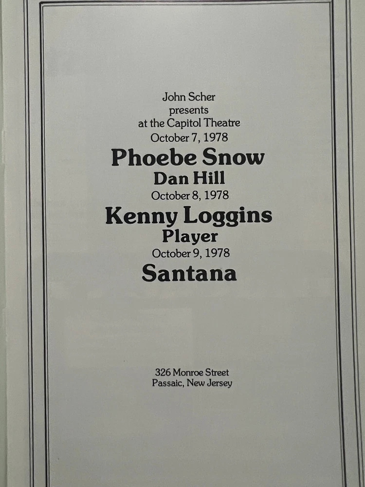 Capitol Theatre Passiac New Jersey 1978 Concert Program October 7 1978 Phobe Snow + Dan Hill October 8 1978 Kenny Loggins + Player October 9 1978 Santana Measures 5.5 x 8.5 Inches In Near Mint Condition.