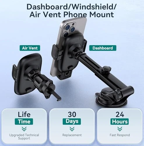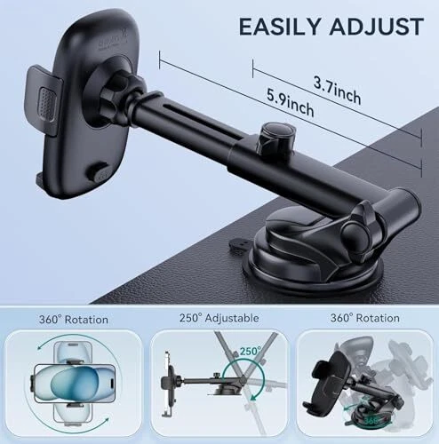Return Policy Fast Delivery Trusted seller Phone Holders for Your Car [Ultra-Durable Suction] Cell Phone Car Mount for Dashboard Windshield Air Vent Universal Automotive Accessories Car Mount Cradles Fit for iPhone Android Smartphones Product Description Strong Suction Cup: iPhone car mount adapts with heat-resistant TPU material suction which can be used normally in extreme heat or cold environments. No worries about stickers melting. With a high-durability strength base, it can provide strong suction when pressing the suction button lock on smooth surfaces. Not contaminated by dust, just wash it with warm water to easily restore it. Unlimited Freedom: Phone mount for car cradles not limited by the angle of space. The adjustable telescopic arm extends from 3.7 inches to 5.9 inches. The 360° ball joint allows your phone mount to be installed at any angle and distance as your please. Super Installation Compatibility: No matter what type of car you drive, the car cell phone holder is equipped with suction cup and air vent clip, and you can freely choose to install phone mount on the dashboard, windshield and air vents, and can be used in multi-scene. Super Installation Compatibility: No matter what type of car you drive, the car cell phone holder is equipped with suction cup and air vent clip, and you can freely choose to install phone mount on the dashboard, windshield and air vents, and can be used in multi-scene. Car Phone Companion: Phone stand for car has large-sized adjustable feet fit all 4.0-7.1-inch smartphones and other devices with thickness ≤ 14 mm. The extra thick airbag silicone layer clip arms provides a stable grip and protection, ensure your iPhone is scratch-free. Shipping Returns Payment Shipping Shipping is FREE to all addresses other than APO/PO boxes in the lower 48 states. All our stock ships from US-based warehouses. Shipped via USPS or UPS (depending on location and package weight) Unless stated otherwise, all orders will ship within 24-72 hours of your payment being processed. Check our feedback to see the great reviews of FAST shipping we offer. Returns Seller does not accept returns Payment We currently accept payment via eBay managed payments only. Once payment is cleared, we will dispatch your shipment within 1-3 business days. Please refer to the "Shipping" tab for more information regarding shipping speed to your destination.
