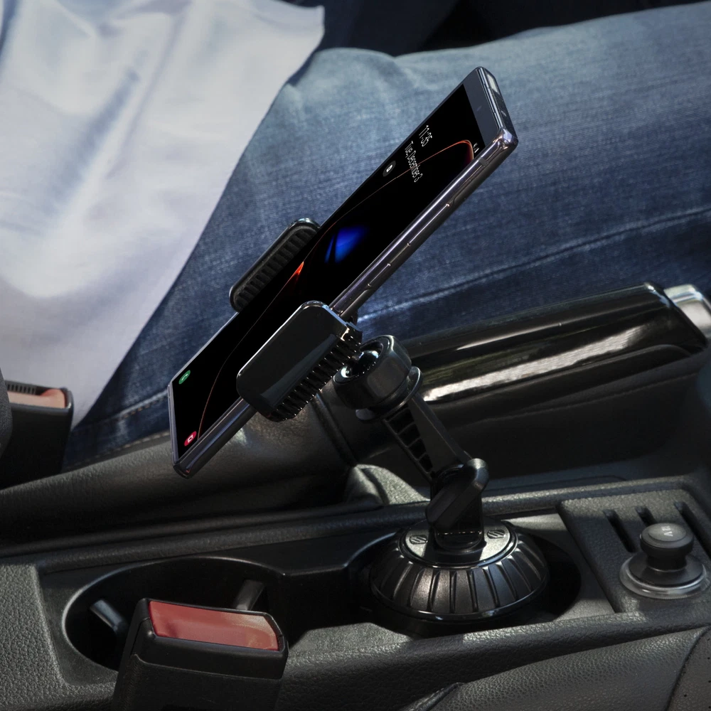 Universal Cup Phone Mount is the perfect solution for conveniently mounting your Smartphone devices to your vehicle’s cup holder. The mount's adjustable base will fit into just about any vehicle cup holder. Rotate the bottom portion of the mount holder base to reduce the base in size and place the base of the mount inside your vehicle’s dashboard or center console's cup holder, then rotate the top portion to expand and secure it in place. Securing your device is easy: just place it between the adjustable arms and lock it securely in place. The arms accommodate any device, up to 3.5” wide. The 360-degree, rotating adjustable head rotates the car phone, mount holder, with an iPhone, Android, or any other mobile device seamlessly between portrait and landscape orientation in a snap. Safely and quickly secure a cell phone or mobile device with the mount’s adjustable base to almost any vehicle cup holder Package Includes: (1) Quick-Grip Cup Mount, (1) Rotating Adjustable Cup Base, and (1) User Manual 3-year Warranty Magic Mount arms adjust to fit Smartphone devices up to 3.5” wide The360-Degree, rotating adjustable head provides customizable viewing options for your mounted device The bottom portion of the mount base rotates to reduce in size and the top portion rotates to expand in size for a secure fit into any cup holder