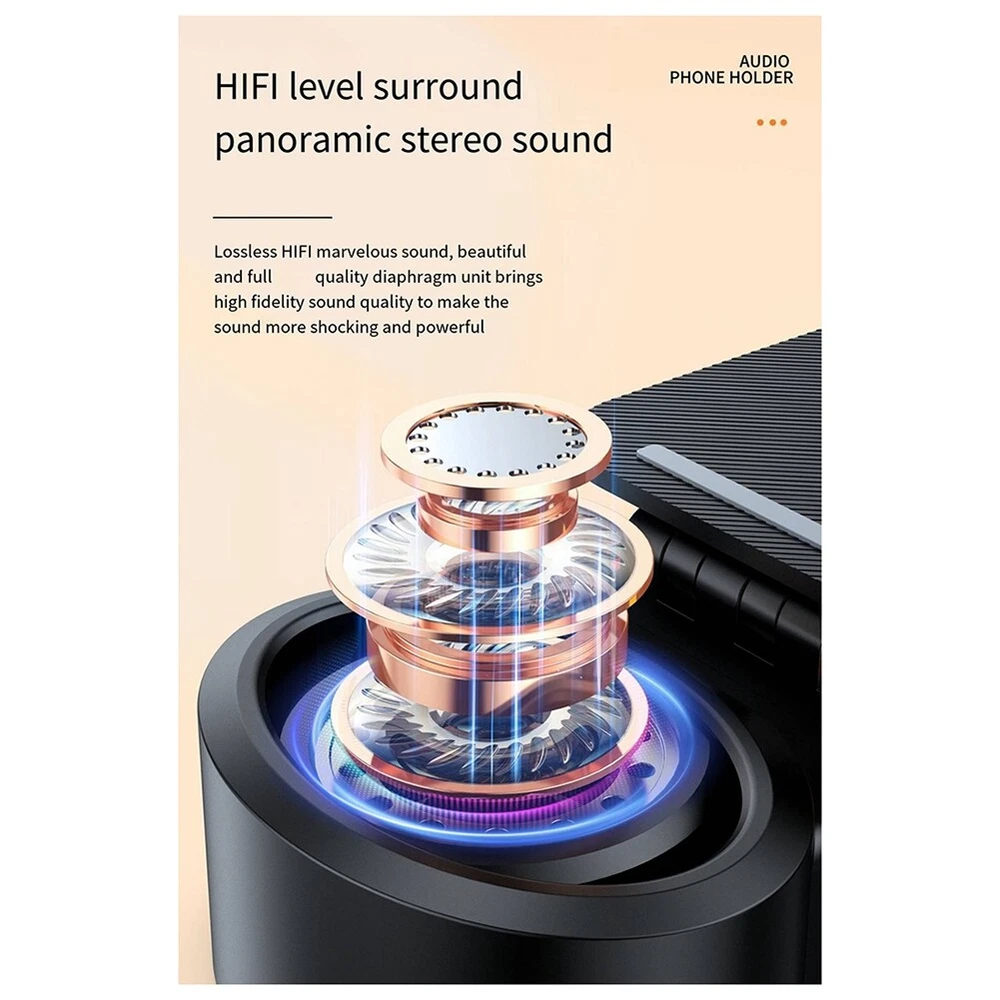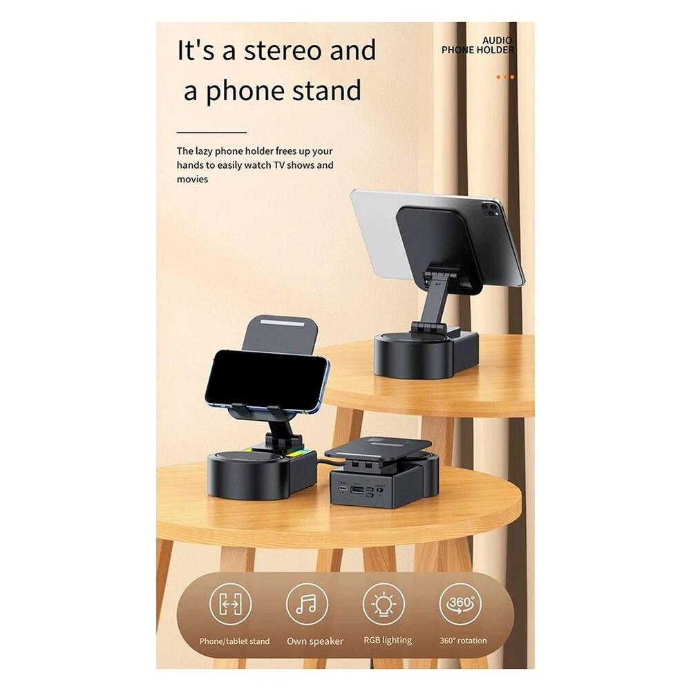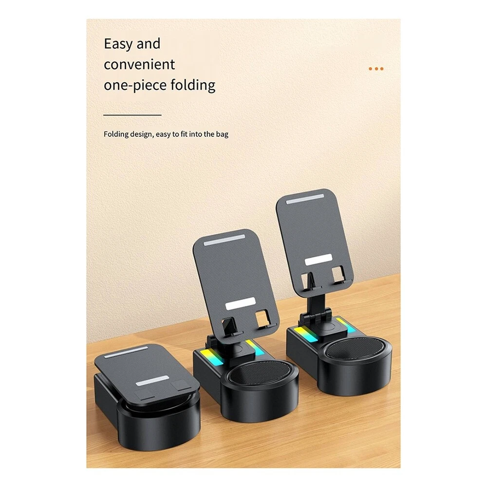Phone Stand Speaker Cradle Adjustable for Office Foldable Cellphone Stand7992 [Multi Functions]: Phone stand with wireless speaker, and support charging for phones, 2000mA large capacity rechargeable, play to 8 hours. [Adjustable Angle]: Liftable and rotatable phone cradle, the angle and the height of the phone holder are adjustable to meet your needs for a better view angle. [RGB Light Effect]: The phone bracket has 360° RGB colorful ambience light effect, changes with the rhythm of music. [Portable Size]: The foldable phone stand for desk is small and , easy to carry in your pocket or bag, and suitable for home, office, travel or business trips. [Nice Gifts]: Universal desktop tablet and phone holder, suitable for most tablet and smartphones, it is a nice gift for your friends and family. version: 5.0 Battery capacity: 2000mAh Play time: about 8h Colour:Black Material:plastic Package Contents: 1 x Rechargeable mobile phone holder