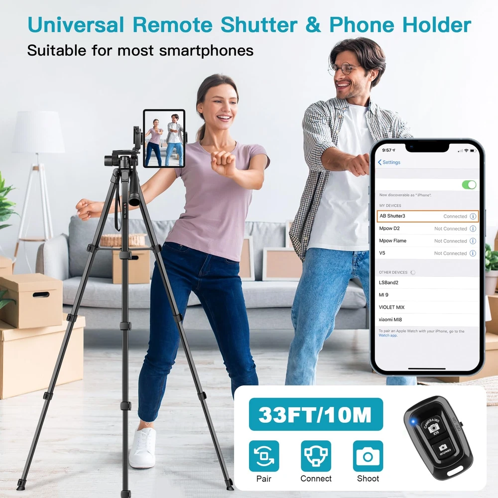 iPad Tripod 【 Phone Tripod with Universal 2-in-1 Tablet Holder】phone and tablet tripod comes with a 2-in-1 clip, can carry both cell phone (landscape/vertical) and tablet. Compatible with iPad, iPad Air, iPad Pro 10.2"/10.9"/11"/12.9", iPad mini, and many other tablets. For smartphones like iPhone15 14 13 12 11 Pro/XS/XR, Samsung, Xiaomi, Huawei, etc 【Multi-functional Tripod Kit & 3-Way Pan Head】Versatile camera tripod comes with Standard 1/4" screw mount, performs well with a wide range of devices, compatible with small cameras/DSLR/Gopro/webcams/ring light. Stable and smooth 3-way pan head can freely adjustable angles for 360° panoramic shooting, 180°up & down shooting, and 90°vertical portrait , which can satisfy all the needs of vertical, horizontal, and overhead photography, etc 【Wireless Remote Shutter】Phone tripod stand is equipped with a wireless remote, easily connect your phone (iOS and Android), tablet, camera.It allows you to conveniently capture photos and videos from a distance of up to 33ft/10m. No need to touch, you can easily realize photo shooting, video shooting 【Stable Tripod Adjustable Height】Tripod stand easily extends the tripod height (from 16.9 inches to 68 inches) by adjusting the quick-release leg locks, perfect for various photography heights. Non-slip rubber feet provides strong stability, withstand up to 9.3 pounds of pressure. It provides reliable support for various photography needs, selfies, camera photography, live streaming, vlogging, pursuing fitness activities or practicing dance 【Portable Travel Tripod】 Tripod stand comes with a convenient storage bag, lightweight and compact, weights 1.65lbs, folded size is 15.7 inches, and it's easy to transport and store