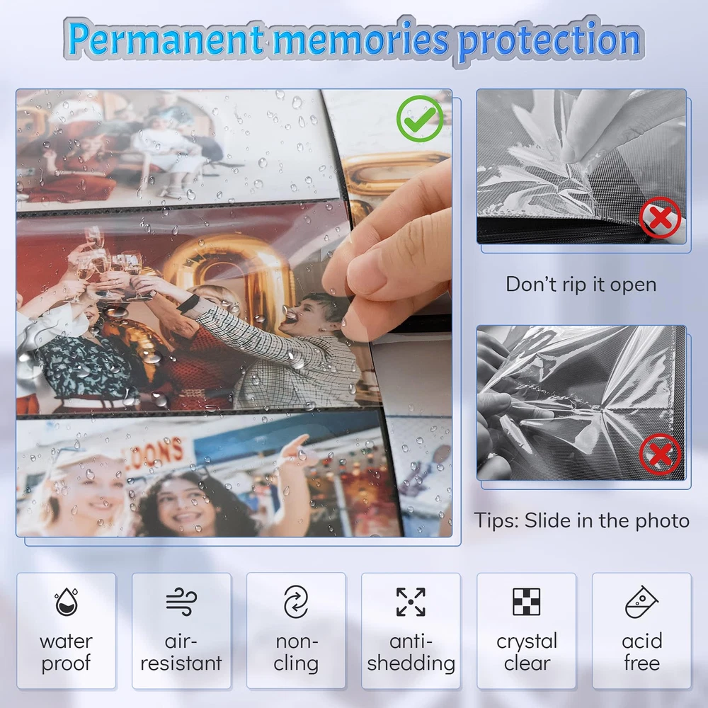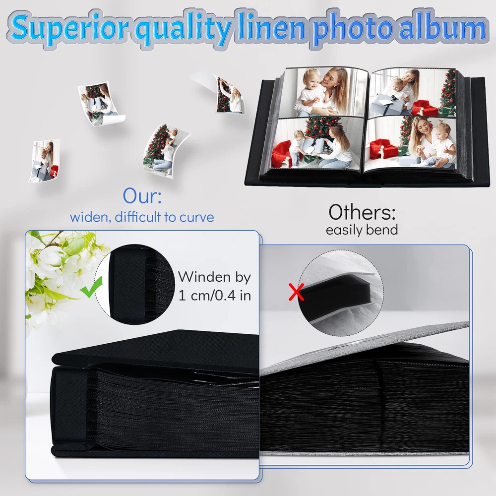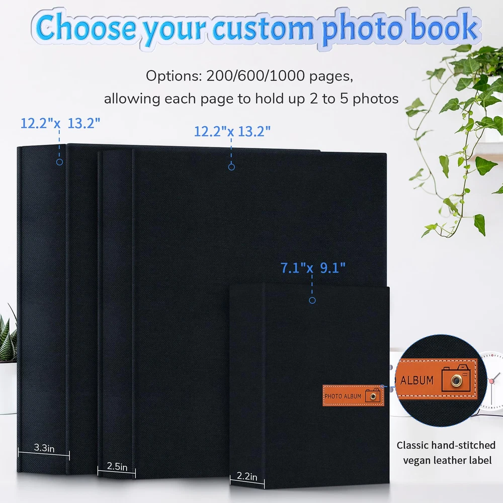 🙊Pefect size with a generous capacity: Our photo album can place 600 photos, allowing each page to hold 5 photos. The dimensions of the 600-page album are 12.2 x 13.2 x 2.5 inches, making it a convenient and spacious choice for preserving your precious memories 📖Durable inner pockets: The black inner pages of our albums are crafted with utmost care, made from acid-free and PP materials that not only protect your photographs from dust, water, and physical tearing, but also preserve the emotions and stories they hold. Every touch of these pages evokes a flood of memories, transporting you back to those special times. 👌Superior quality linen cover: This album's linen cover have classic hand-stitched leather label, ensures aesthetic appeal and long-lasting protection for your cherished memories. Our slip-in picture albums are wrapped in a fine linen cover.The book spine has been reinforce to prevent it from becoming too inflated when you fully insert your precious memories. 💟A personalized keepsake: Our photo albums are more than just a organizer of pictures; they are a reflection of your unique journey. They hold the real touch memories of baby's first steps, family reunions, adventures with friends, the unconditional love of pets, and the sweet moments shared with your significant other. These albums become a tangible embodiment of your most cherished experiences. 📦Dedicated to exceptional after-sales service: Your satisfaction and happiness are our utmost priority. We are here to support you every step of the way, ensuring that your shopping experience is smooth, enjoyable, and filled with emotions. Our dedicated team is ready to promptly address any questions, concerns, or issues you may have