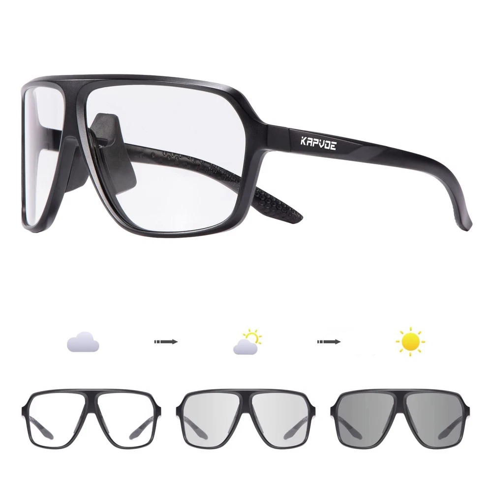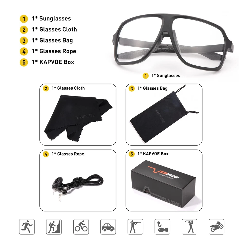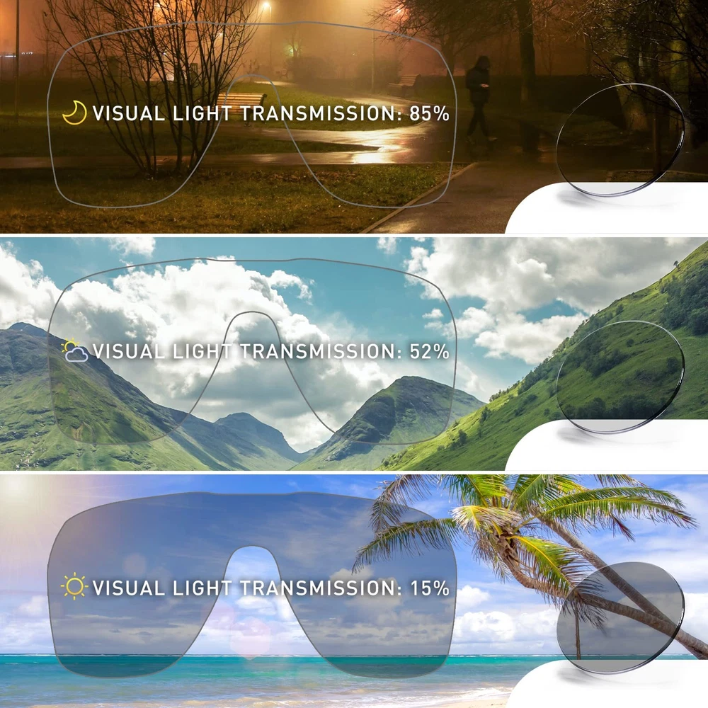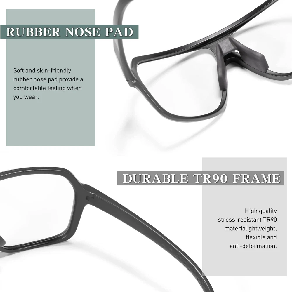 【Photochromic Sunglasses】The transition mountain bike glasses darken and brighten according to the light conditions, they change from clear to gray in sunlight, effectively maintain a suitable brightness to protect your eyes in strong sunshine. No need to change glasses. 【UV400 Protective Lenses】cycling sunglasses can defend against 100% of UVA/B/C rays and harmful blue light to 400nm, which can avoid avoid aging eye diseases and vision problems. Fits both men and women. 【PC lens + TR90 frame】 These mtb glasses are equipped with durable PC lens, shatterproof and scratch-resistant effectively. The flexible TR90 frame provide you with more comfortable wearing experience. 【COMFORTABLE & LIGHTWEIGHT】 The anti-skid nose pad and silicone temple make the running glasses fit more comfortable on the bridge of your nose and above the ears. Only weight 27g, great to wear for long periods of time. 【Multifunctional Occasions】Sports sunglasses can be used for multiple activities, such as golf, baseball, cycling, driving, fishing, skiing, runing, racing, boating, and other activities.