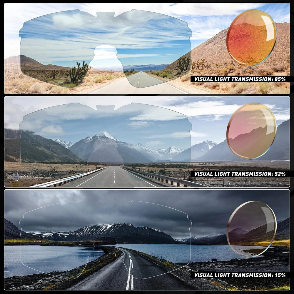 【Photochromic Glasses】The photochromic sunglasses darken and brighten according to the light conditions, they change from clear to red in sunlight, effectively protecting your eyes while providing a comfortable viewing experience. 【UV400 Protection】Thicken PC lenses with UV-Protective coating, shatterproof and scratch-resistant effectively, KAPVOE MTB glasses can defend against 99.9% of UVA/B/C rays and harmful blue light to 400nm, which can avoid aginst eye diseases and vision problems. 【Adjustable TR90 Frame】 Exquisite adjustable rubber legs, which can be pushed and pulled in 4 holes, makes SCVSN cycling sunglasses suitable for various face shapes, and the breathable nose pad can prevent misting, both make the mountain bike glasses more convenient to wear. 【Wrap around sunglasses】The wrap-around HD lenses design combines ergonomics to protect against wind and sand, allowing you to ride unhindered. With a performance features and a stylish look that fits your face like a custom pair of sunglasses. 【Lightweight Design】 With ultralight frame, forget you are wearing sports sunglasses in an adventure, don't let heavy sunglasses weigh you down, ideal for usage by cycling, driving, running, baseball, fishing, racing, golf, softball, climbing, trekking or other outdoor activities.