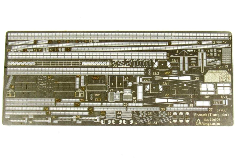 Enhance the precision of your German Battleship 'Bismarck' model with Trumpeter's photo-etched detailing set. Designed for ultimate accuracy and realism, this set includes all necessary parts for intricate detailing. Perfect for avid modelers and history enthusiasts. MD 700206 Photo etching kit for the battleship " Bismark " from Trumpeter . The scale is 1 : 700 . Material : nickel silver 0.12 mm . The set is equipped with a photo etching plate and a color photo instruction .