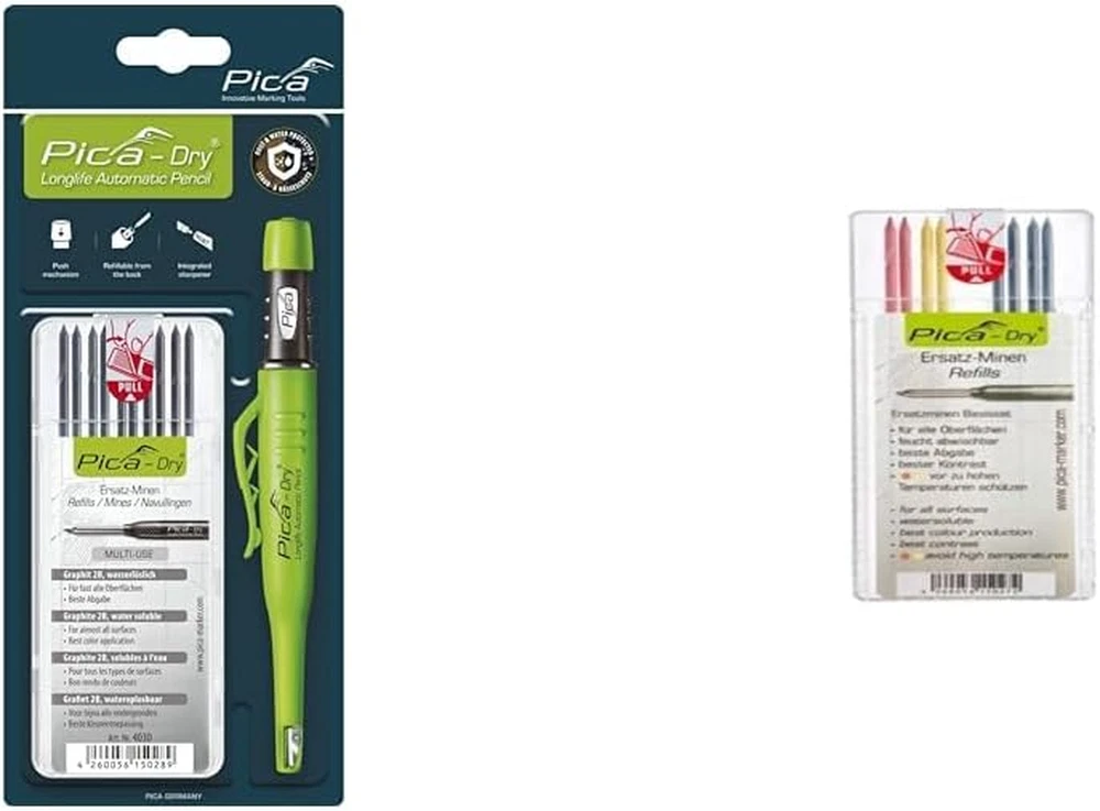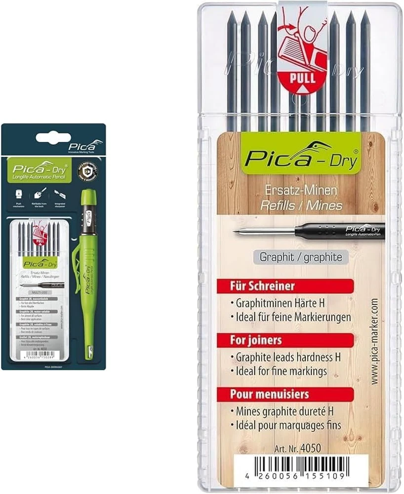 Pica-Dry Graphite Lead 4050 Especially for Joiners Graphite lead in special hardness H Ideal for fine markings For use on dry surfaces No wipe clean Lead diameter: 2.8 mm length: 125 mm For carpenters and joiners.