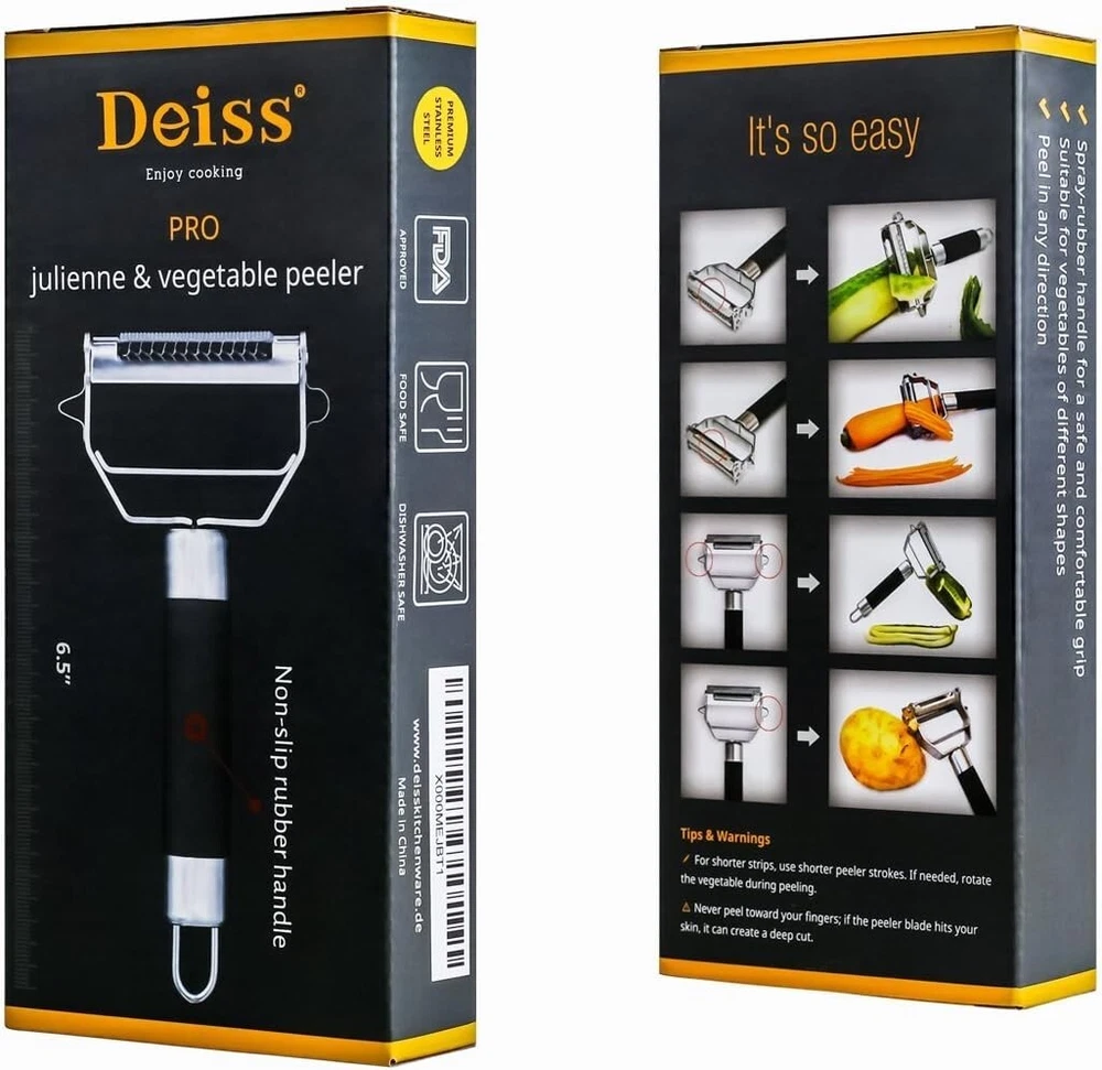 PRO Dual Julienne Peeler & Vegetable Peeler - Non-slip Handle - Apple Peeler & Potato Peeler, Orange Peeler, Zoodles Maker - Y Peeler, Veggie Peeler for Making Delicious Veggie Noodles ✅ RAZOR-SHARP & MULTIFUNCTIONAL - Citrus peeler, julienne slicer, knifer, potato cutter is all-in-one tool . Peeling, slicing and julienning have never been so simple. Stainless steel blades easily glide even through the toughest vegetables. One device can be used as a cucumber peeler, cucumber slicer, carrot peeler, and even citrus peeler! ✅ COMFORTABLE TO USE & BUILT TO LAST - Deiss vegetable peelers for kitchen are built from high quality stainless steel that won't rust and will last for years to come. Comfortable non-slip handle of julienne cutter provides a firm grip even if your hands are wet or oily. Soft coating on apple corer peeler slicer, apple pealer takes the pressure off your hand, so you won't get tired while peeling. ✅ COMPACT & DISHWASHER SAFE - Save space in the kitchen by replacing bulky electric vegetable peeler, hard-to-clean kitchen tools and gadgets with a single Deiss fruit peeler. It easily fits into any drawer or can be hung using the loop on the handle. To wash the lemon peeler just pass it under running water. It's also dishwasher safe. ✅ IMPROVE YOUR COOKING WITH ENDLESS DISH OPPORTUNITIES - Amaze your friends with new, restaurant-like recipes and make your everyday cooking entertaining. Decorating your dishes with delicious-looking garnishes, making zucchini noodles , potato salad, shredded carrots, cutting vegetables and fruit for healthy salads, slicing potato fries and cheese, removing skin from the apple or orange - it's so easy with Deiss kitchen peeler & carrot cutter, carrot shredder.