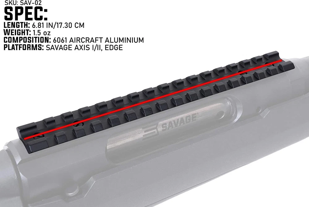 Picatinny rail mount built specifically for Savage Axis/Axis II/Edge rifle platforms with integrated level bubble. Comes with both #6 and #8 screws for compatibility with both older and newer Savage Axis models. Scope mount installs directly to receiver via the factory mounting holes and included set screws with no additional hardware required Allows for the mounting of Picatinny or Weaver standard scope rings, scope mounts, red dots, or other optics Integrated level bubble built into the rear of the rail to check for consistent vertical alignment of your rifle All scope mounts and accessories come with a lifetime guarantee
