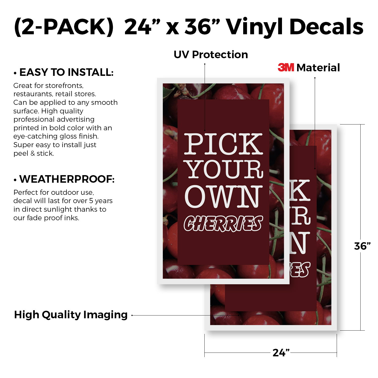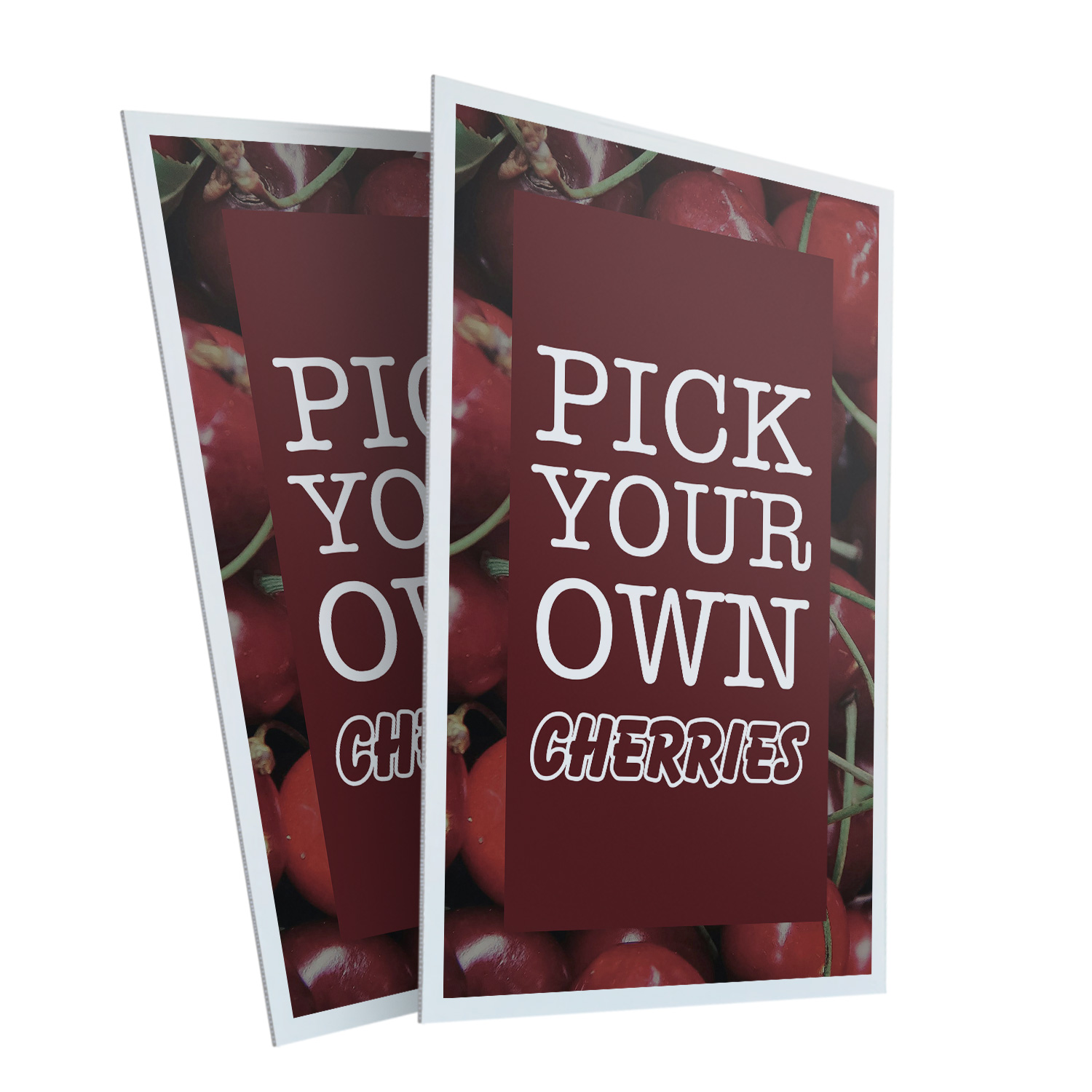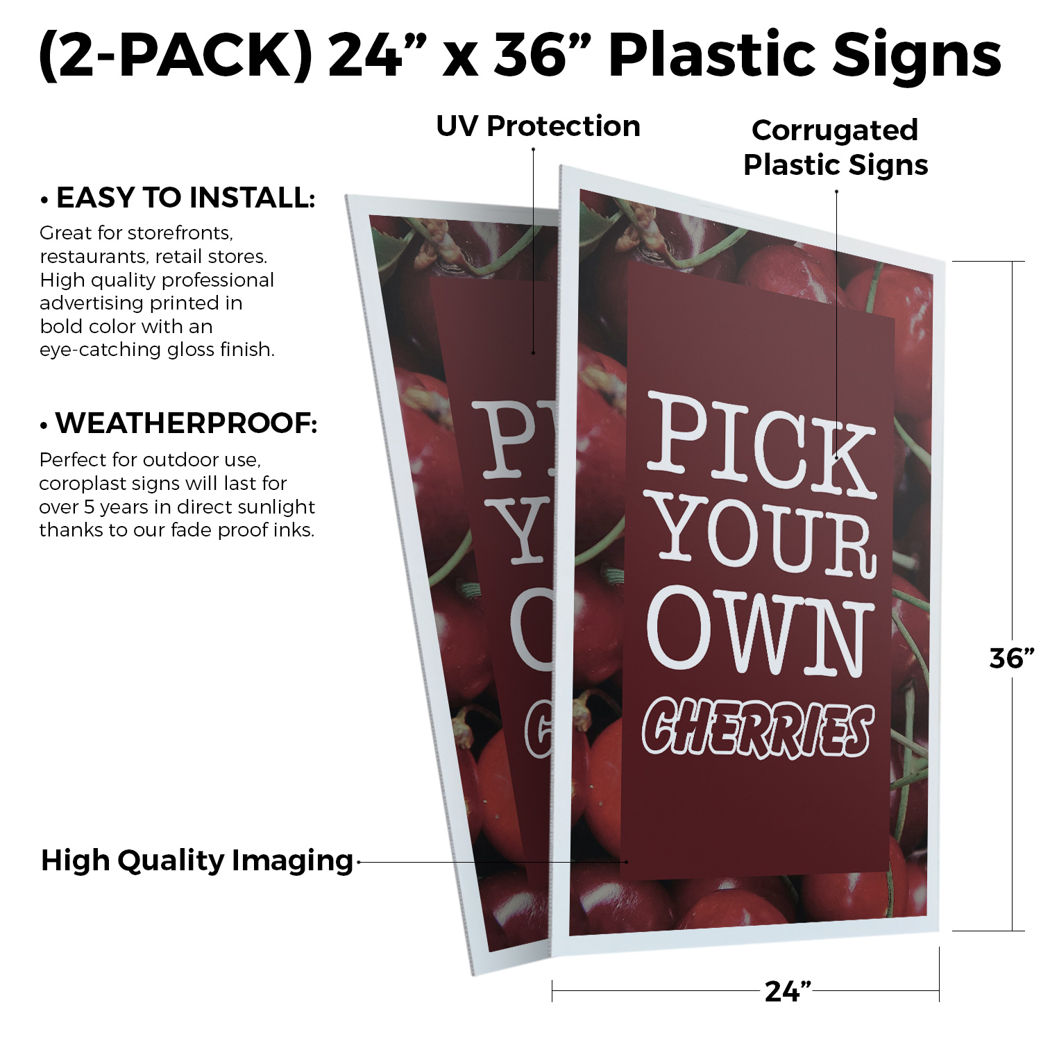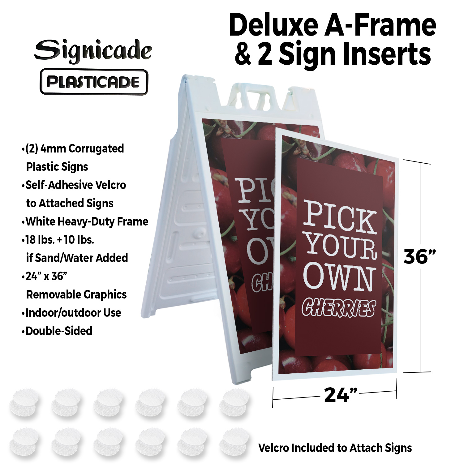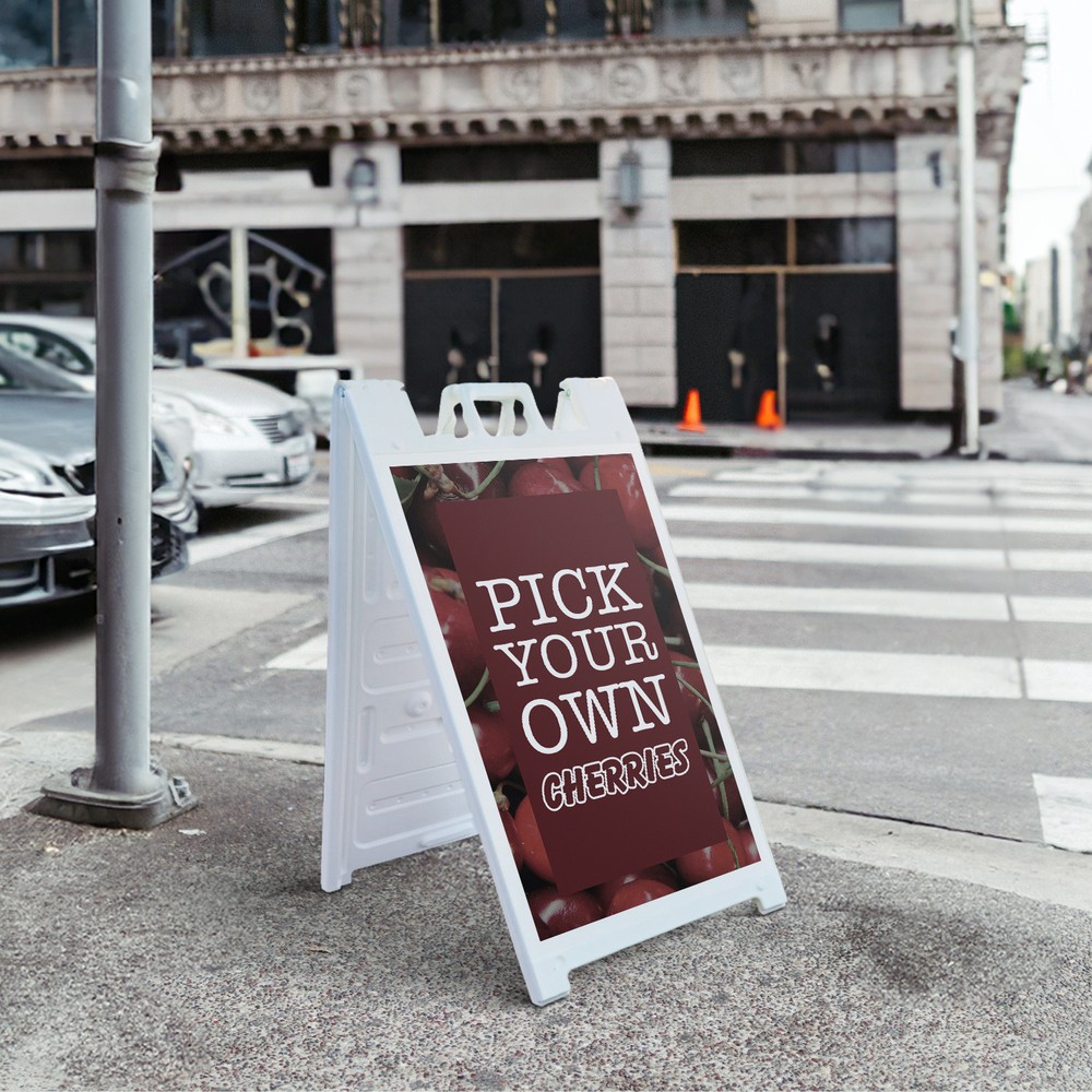 Pick Your Own Cherries 24" x 36" Double Sided A-Frame Sidewalk Sign Includes 2 Installed Decals Foldable Portable White Signicade Sandwich Board Sweet Fruits Orchard Fresh Seasonal Favorites Universal 2 eBay Template by Finest Design Vinyl Banners Aluminum Signs Safety Signs Yard Signs Designer Aluminum Signs Novelty Signs Vinyl Banners Aluminum Signs Safety Signs Yard Signs Designer Aluminum Signs Novelty Signs Description Pick Your Own Cherries Heavy Duty A-Frame Sidewalk Sign Sweet Juicy Seasonal SignMission Deluxe A-Frame Signs Heavy-Duty - Portable - Reusable - Weather Resistant A-Frames, also known as sandwich board signs, are an easy and affordable way to advertise your business or event. The durable thick plastic frame allows them to be placed both indoors and outdoors in any conditions except extreme weather. They are also extremely easy to set up, take down, and move from one location to another as needed. Our Signicade Deluxe A-Frame is available with two installation options: Decals Installed – The sign graphics are printed on high-quality vinyl decals that come pre-installed on the frame. Corrugated Plastic Signs Installed – Includes two 4mm corrugated plastic sign inserts that are attached using self-adhesive Velcro (included). Need to switch up your messaging? Extra sets of inserts are available in both decal and corrugated plastic options. Order multiple sets and change your message in just a few minutes! Simply search for SignMission 24” x 36” sign inserts to get additional replacements. Product Features & Specs (2) 4mm Corrugated Plastic Signs OR Pre-Installed Decals Self-Adhesive Velcro (For corrugated plastic option) White Heavy-Duty Frame 18 lbs. + 10 lbs. if Sand/Water Added 24” x 36” Removable Sign Graphics Indoor / Outdoor Use Double-Sided A-Frame Features Weatherproof: The combination of high-quality plastic and added weight from sand/water makes these signs perfect for outdoor use. Rain or shine, your A-Frame sign can endure it all. Maximum Visibility: Because every A-Frame is double-sided, you can make sure everyone sees your message. Portable: The collapsible A-Frame and convenient handle make it easy to move your sign from one location to another. Reusable: Store your signs and use them as you always have, swap inserts to change your messaging, and use your A-frame signs for years to come. Weight: 18 lbs. (Weight does not reflect when the frame is filled with water or sand, which can add 10 additional lbs. when full.) Details: Durable heavy-duty plastic frame with a regressed double-sided sign area (24”x36”). Foldable with a molded handle for easy grip and carrying. Fillable frame for greater stability. Swappable corrugated plastic graphics or pre-installed decals. Portable. Uses: Indoor/Outdoor. Trade shows. Sidewalk advertising. Daily specials and menus for restaurants. Point-of-purchase displays. Event and foot traffic. Directional signage. Estimated Lifespan: 5+ years with proper placement and care. Size: 45"H x 25"W x 3"D - Frame; 24" x 36" Graphic Area.