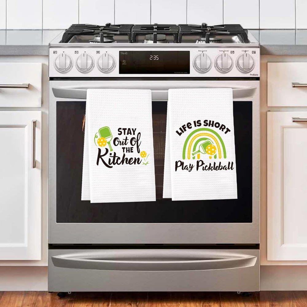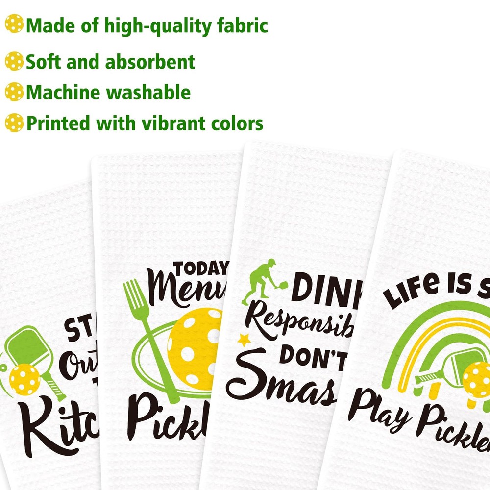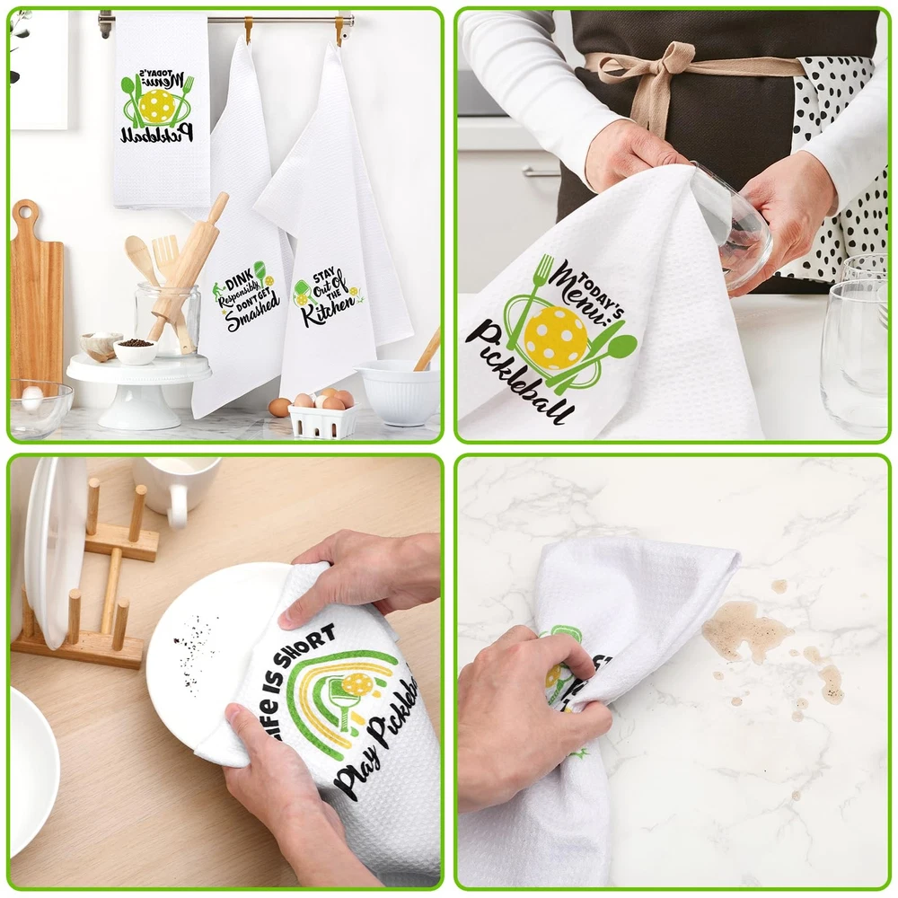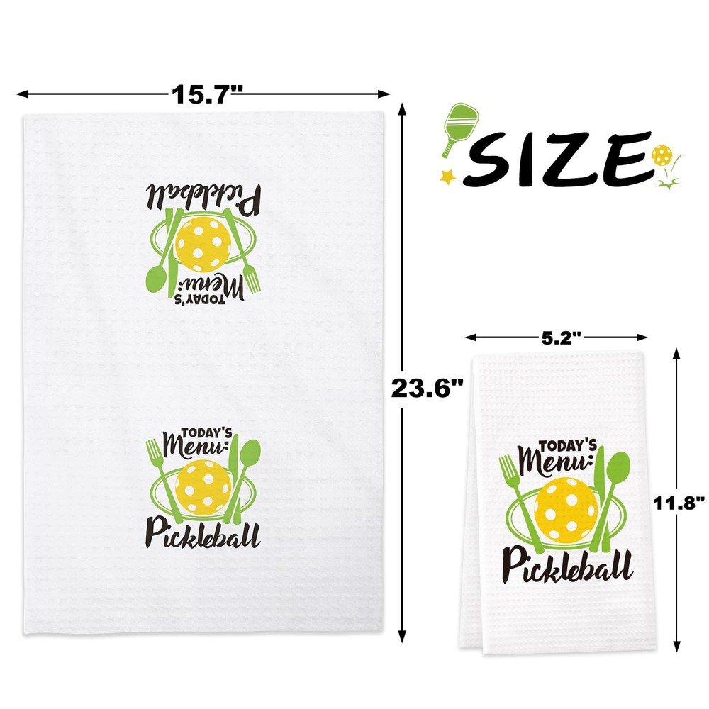 Package includes: Includes 4pcs pickleball themed kitchen towels printed with novelty pickleball patterns and sayings. Material: Made of absorbent soft polyester and polyamide. Size: Measures about 15.7*23.6 inches and 5.2*11.8 inchens when folded. Functional Towels: With these towels, you can do the hand drying, dry dishes or utensils, sop up a quick mess, clean counter tops, table or windows. They are also proper for your home and kitchen decor by hanging on the oven handle, counter top or towel rack. Pickleball Kitchen Towels Set: Package includes 4pcs funny pickleball kitchen towels, which is printed with adorable pickleball patterns and funny sayings. The will surely win the pickleball fan's heart! Unique Christmas Pickleball Gift: These cute kitchen towels fit for the ones who love playing pickleball. They can be wonderful decorations for the home and kitchen by hanging on the oven handle, counter top or towel rack. Prime Quality: This set of pickleball kitchen towels is made of absorbent soft polyester and polyamide. They are machine washable. Air dry is recommended and please do not bleach on them. Nice Size: The pickle ball kitchen towel measures about 15.7*23.6 inches and 5.2*11.8 inchens when folded. With these towels, you can do the hand drying, dry dishes or utensils, sop up a quick mess, clean counter tops, table or windows. Considerate service - We have full confidence that you will love these kitchen towels. If not, please tell us!
