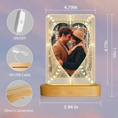 30 Days Return Policy Fast Delivery Trusted seller Picture Frame, Valentines Day Gift for Him Her, Light up 6-inch Photo Heart Frame with LED Night Light, Home Desk Decor Lamp, Best Present for Couple Lover Wife Husband Anniversary Birthday Product Description 【Photo Frame With Light】This unique picture frame features a heart shape that holds a 6-inch photo with a built-in LED light. It goes beyond traditional frames by showcg your photo and serving as a night light. The soft LED glow enhances photo visibility at night, creating a warm and calming atmosp. Transparent materials can better highlight the displayed photos 【High Quality】The picture frame is composed of acrylic and base, base is made of high-quality plastic with wood grain paint, the acrylic is not harmful to human body, no pungent smell, no sharp edges, and is durable. Each box come with a soft cloth for cleaning the frame. Night Light is equipped with a standard USB cable to apply to your computer or mobile power supply and any USB port power supply 【Creative Gifts】This is a frame that conveys your mind. This acrylic heart photo frame night light is the best choice to express love and remembrance for lover, girlfriend, boyfriend and companion, also a good decorative light for the home, room, desk, bedside, table and office. Our unique gift night light will surprise her or him that says it all 【Easy Use & Save Memories】You just need to insert the picture into two acrylic covers and put them into the light base. Each acrylic cover is protected with removable film, please noted that remove it before use. Put photos or self-portraits that belong to your common memories in the photo frame to keep the beautiful memories in another way 【Nice Package & Energy Save】 You will get 2 x acrylic sheet, 1 x Light Base with USB cable, 1x Cleaning Cloth,1 x User Manual. Product Power: 3.3W/ 5V, 0.012kw.h/ 24 hours, only 4.4 kWh per year; LED life: 10000 hours Shipping Returns Payment Shipping Shipping is FREE to all addresses other than APO/PO boxes in the lower 48 states. All our stock ships from US-based warehouses. Shipped via USPS or UPS (depending on location and package weight) Unless stated otherwise, all orders will ship within 24-72 hours of your payment being processed. Check our feedback to see the great reviews of FAST shipping we offer. Returns As our valued customer, we will do our best to make sure the product you receive arrives to you on time and as expected. If you are not satisfied with your purchase, please contact us within 30 days of receiving your order to process a return. Payment We currently accept payment via eBay managed payments only. Once payment is cleared, we will dispatch your shipment within 1-3 business days. Please refer to the "Shipping" tab for more information regarding shipping speed to your destination.