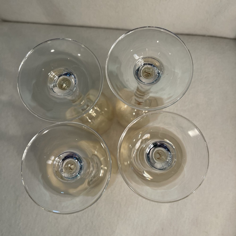 This set of Pier 1 wine glasses features a contemporary design with a solid color pattern in clear glass. Hand-blown with a 6 oz capacity, these round-shaped glasses have a clear stem and stand at 8 inches tall. The set includes four wine glasses, each measuring 2.75 inches wide and weighing a total of 1.9 lbs. Perfect for all occasions, these elegant glasses add a touch of sophistication to any dining table. Excellent condition. No chips or cracks.