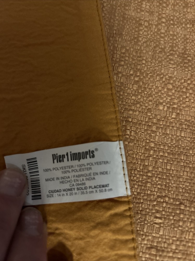 Number of Items in Set:2Type:PlacematBrand:Pier 1MPN:do not applyShape:RectangularCountry/Region of Manufacture:IndiaPattern:SolidItem Width:14UPC:Does not applyTheme:Food/KitchenColor:HoneyMaterial:CottonOccasion:MultipurposeItem Length:20gtin13:Does not apply