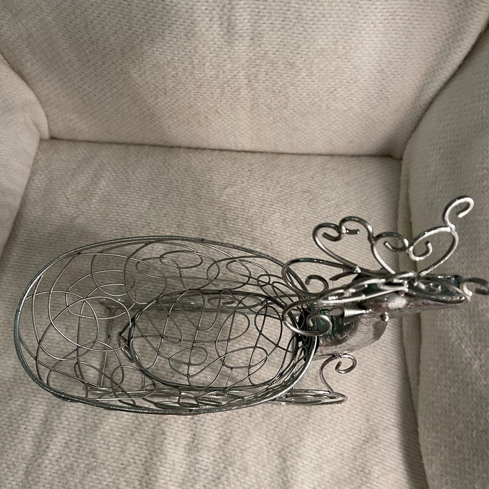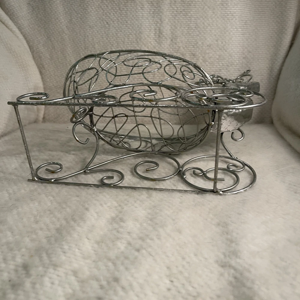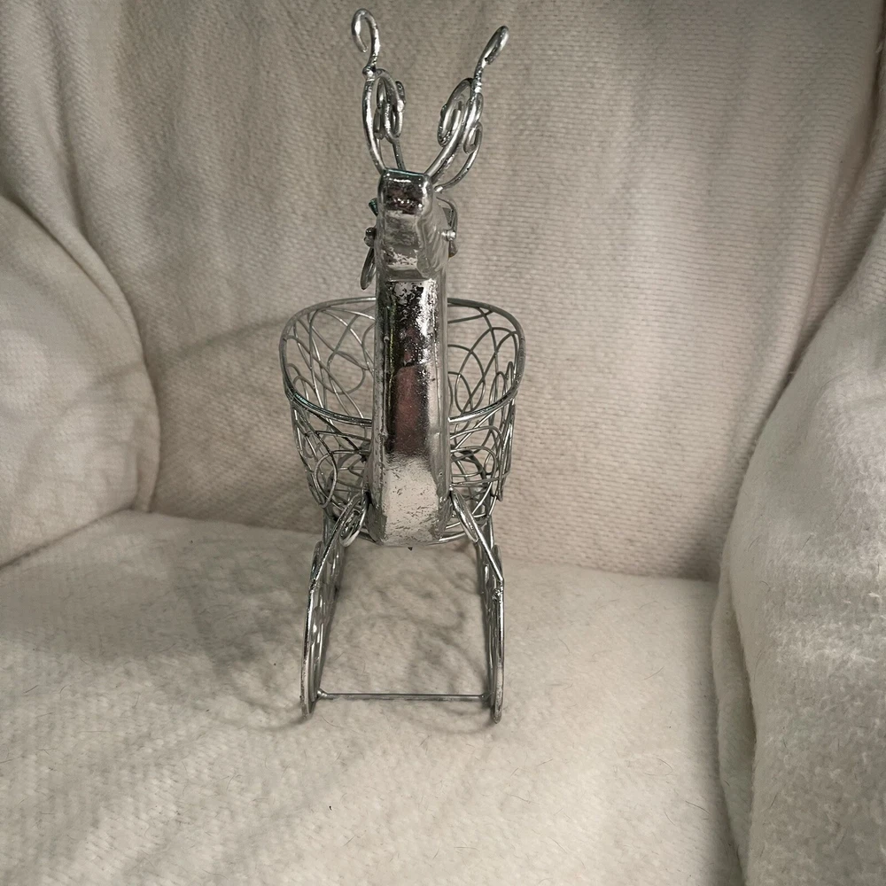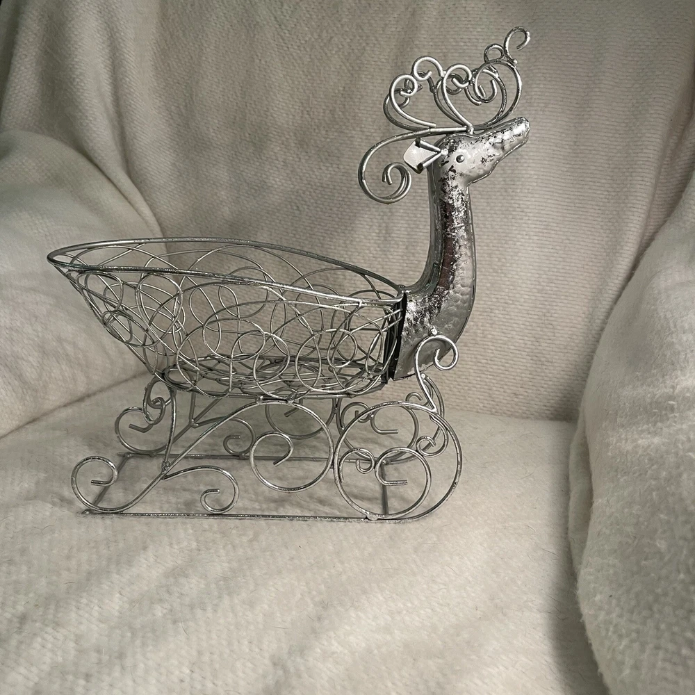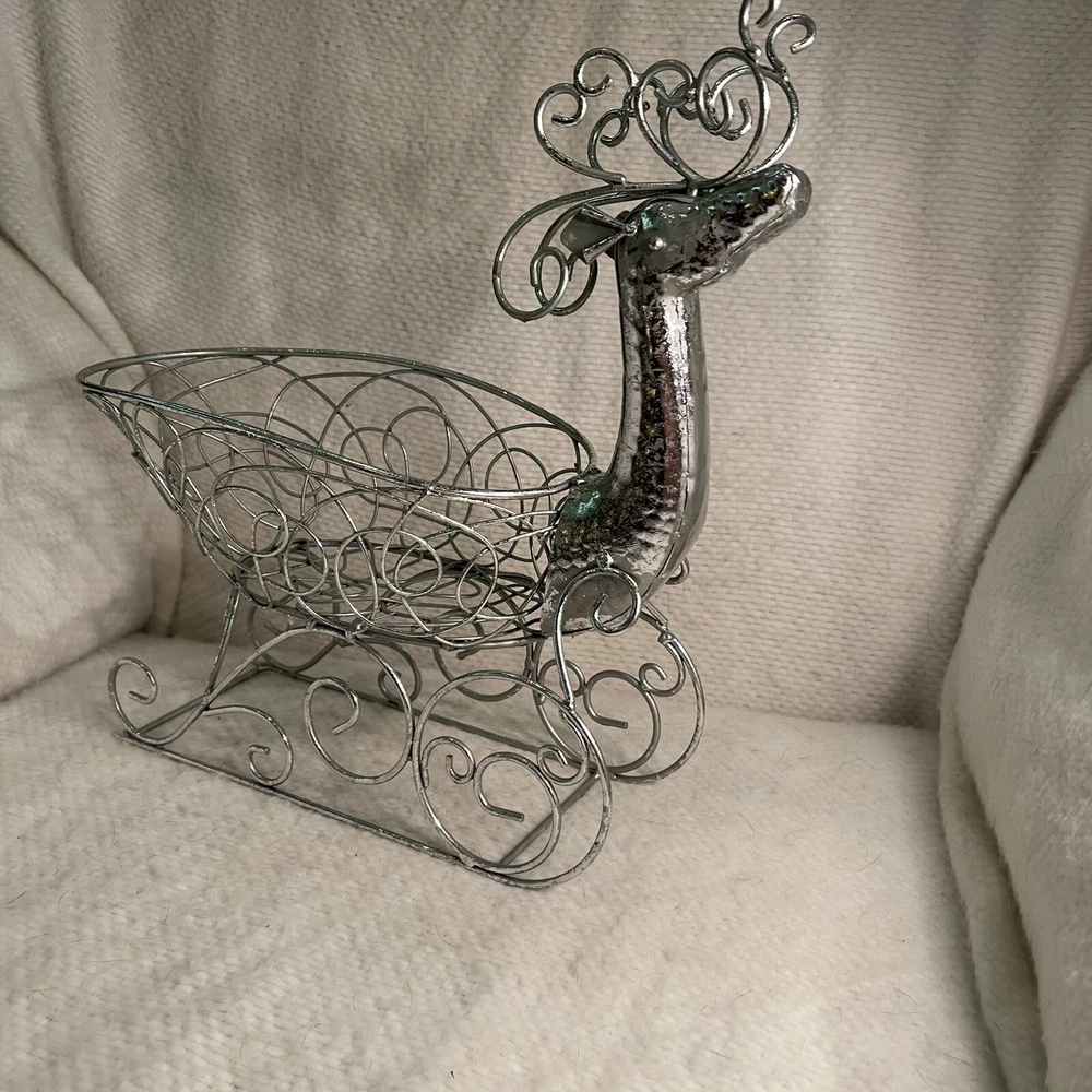 This beautiful Pier 1 Imports reindeer sleigh is a must-have for any Christmas decorator. The large, silver metallic finish of the sleigh and the intricate details of the reindeer figurine make it a stunning piece that will surely catch the eye of anyone who sees it. Measuring 12.5 inches in length and height, and 5.5 inches in width, this contemporary style sleigh is perfect for indoor use during the holiday season. It weighs 1.2 lbs and was manufactured in the 1990s. The sleigh is designed with a Christmas theme and features a reindeer subject, making it a perfect addition to any collection of holiday decor. Excellent condition. New without tags.