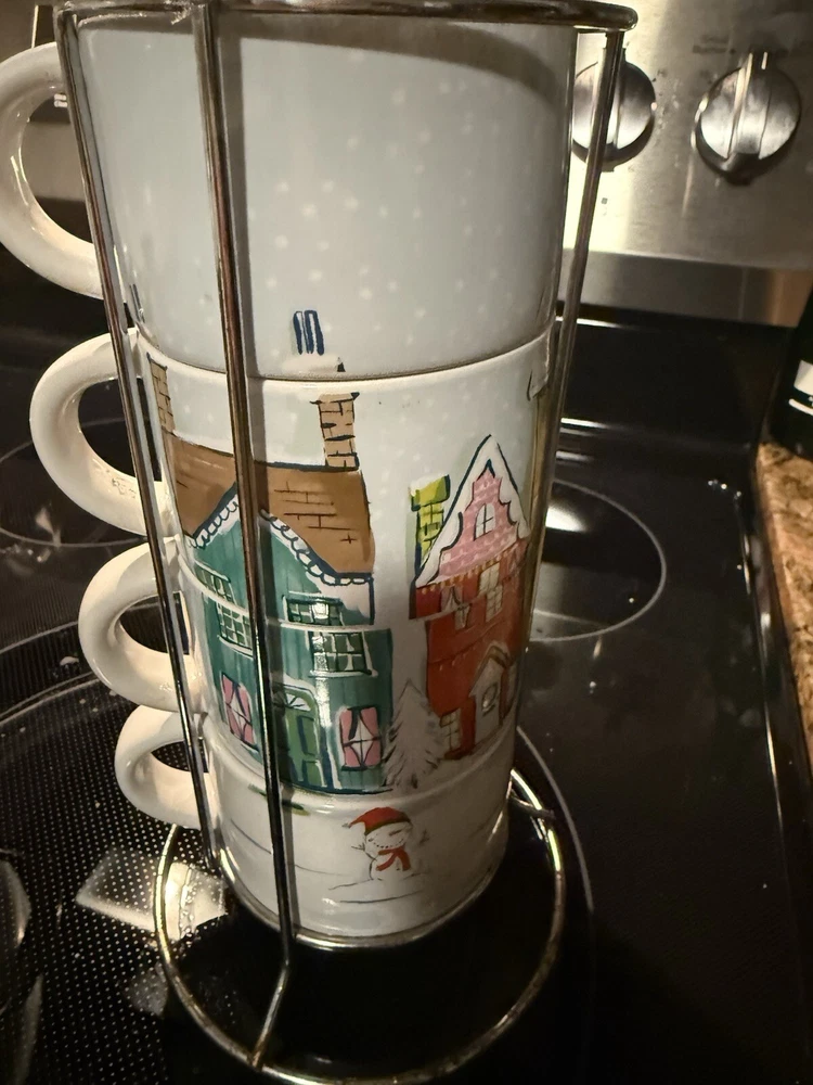 Color:Multi-ColorBrand:Pier 1 ImportsShape:Does not ApplyNumber of Items in Set:Five-PieceService For:4Set Includes:Mixed SetOccasion:Christmas, WinterTheme:ChristmasFeatures:Dishwasher Safe, Microwave Safe, StackableMaterial:StonewareCharacter Family:Does not ApplyPattern:Snow VillageType:Coffee Mug Set