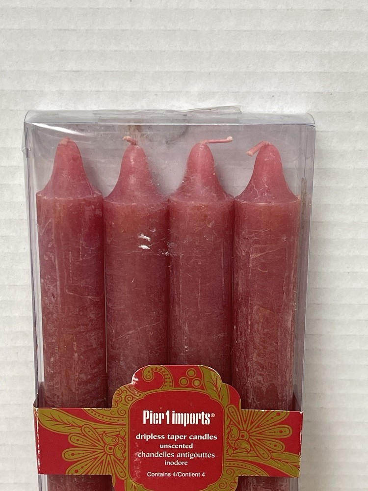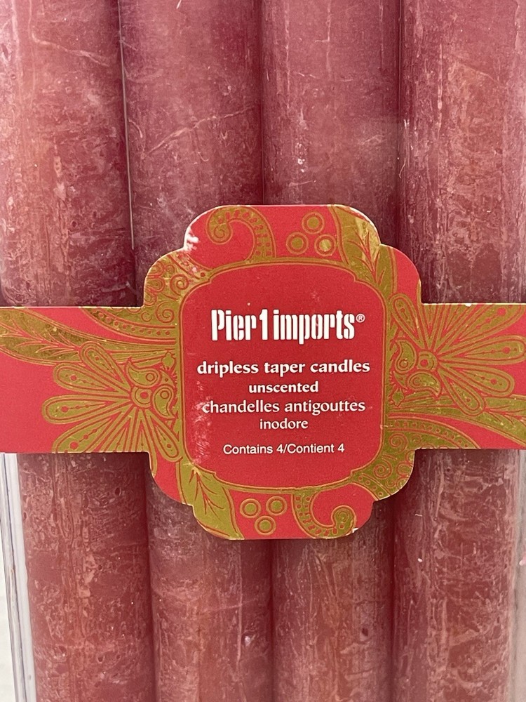 Features: Non-Drip Shape: Taper Number in Pack: 4 Scent: Unscented Brand: Pier 1 Theme: Holiday, Dinner, Classic, Home Decor, Traditional, Country, Farmhouse, Sophisticated, Cottage Item Length: 10 in Type: Set Item Width: 1 in Color: Red