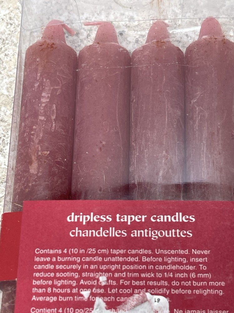 New in Box - Pier 1 set of 4 - 10 inch dripless taper candles 1 inch diameter Color is a wine red, cherry red, burgundy. See photos. Excellent condition