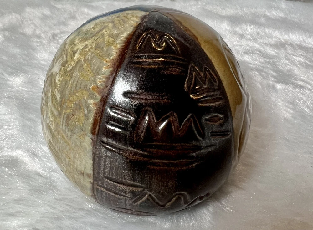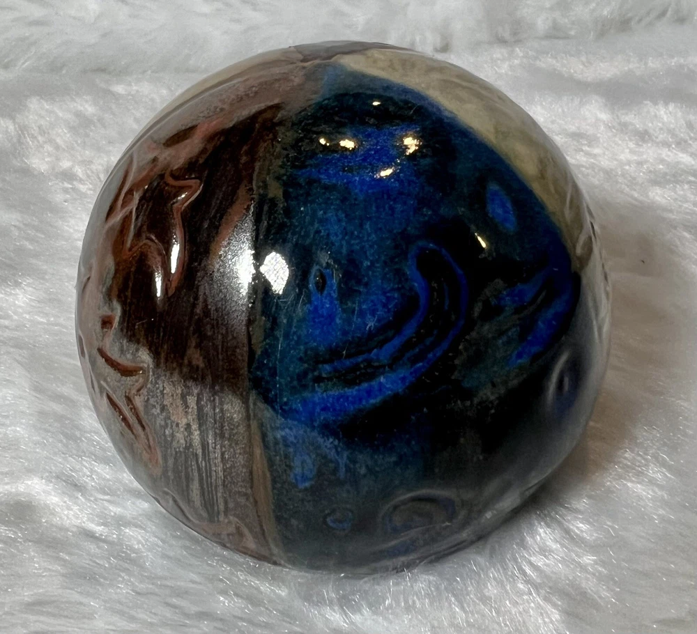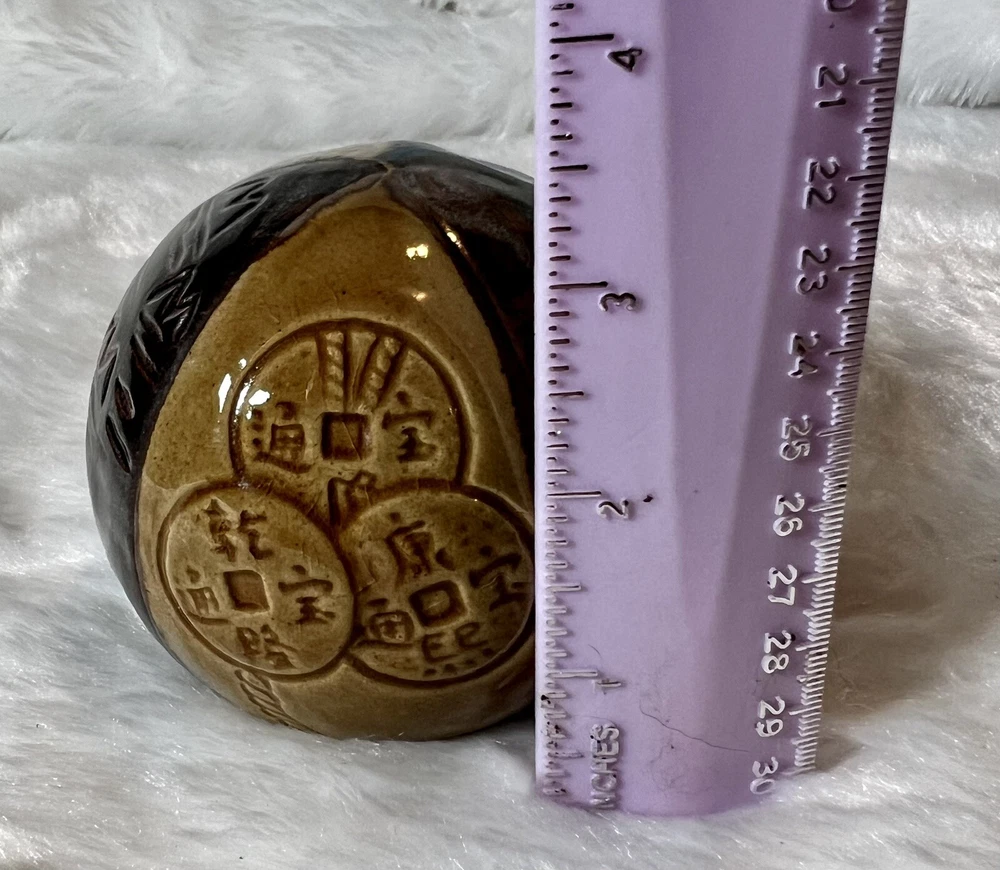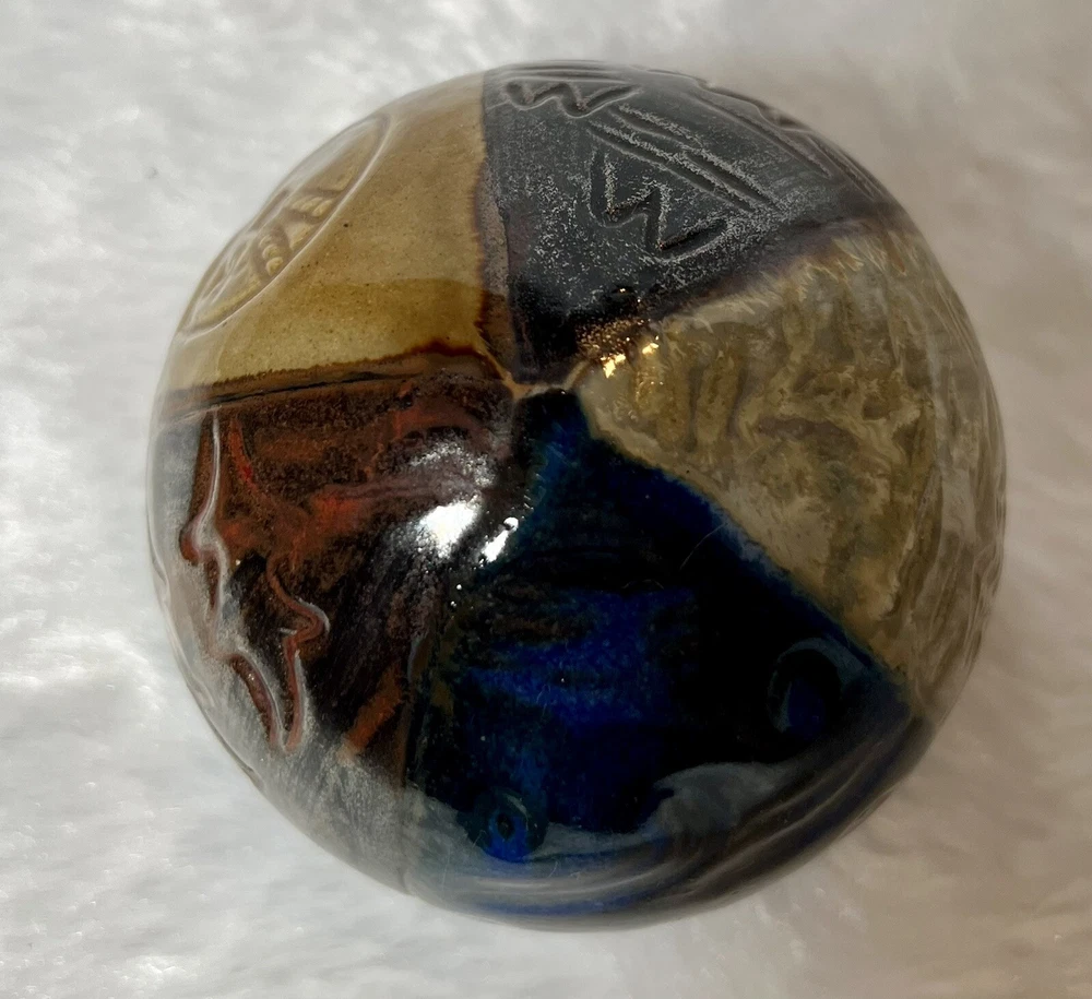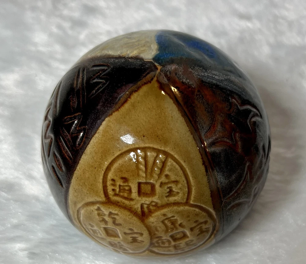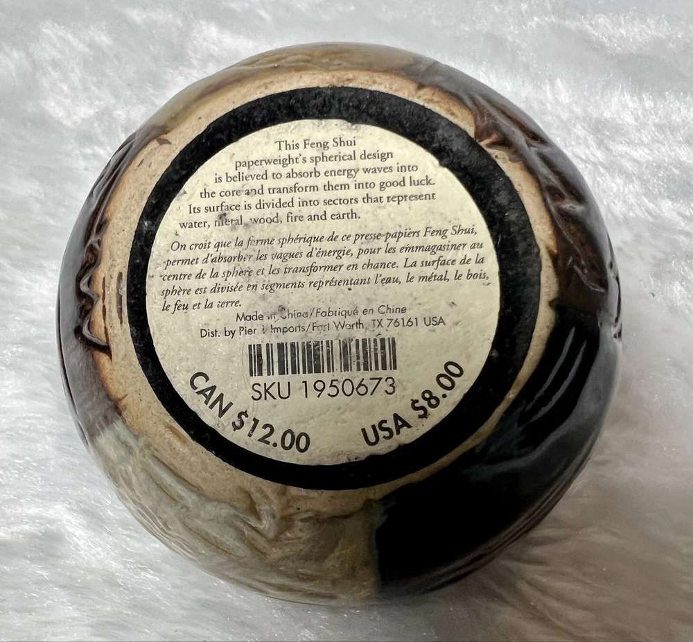 Feng Shui Good Luck Paperweight Asian Design Vintage Pier 1 Ceramic Sphere Ball. Vintage Feng Shui Spherical Paperweight from Pier 1. In excellent pre owned condition. Divided into sections to represent water metal wood fire and earth, believed to absorb energy waves and transform them into good luck. No chips or cracks.