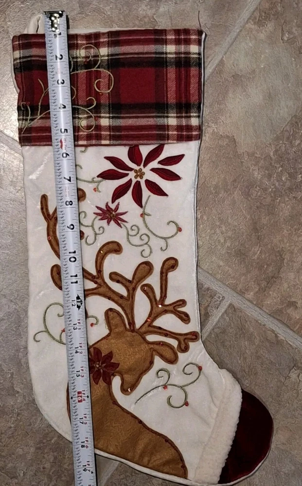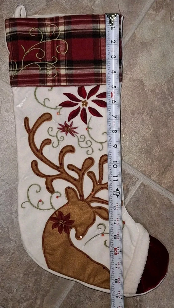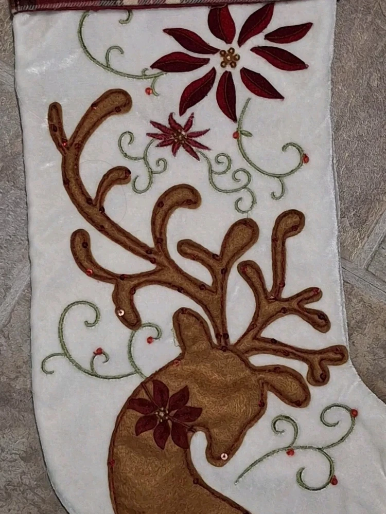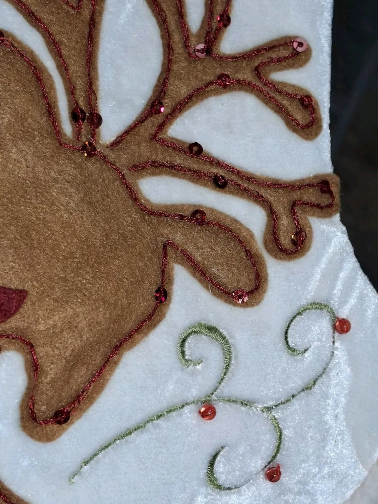 Reindeer Sock Sequins Embellished Pier 1 Reindeer Christmas Stocking Has crushed velvet feel See photos for measurements I consider this to be in good preowned condition There is some writing on inside - see last photo Please view all photos zooming in on them as they are part of the description for you to judge condition.