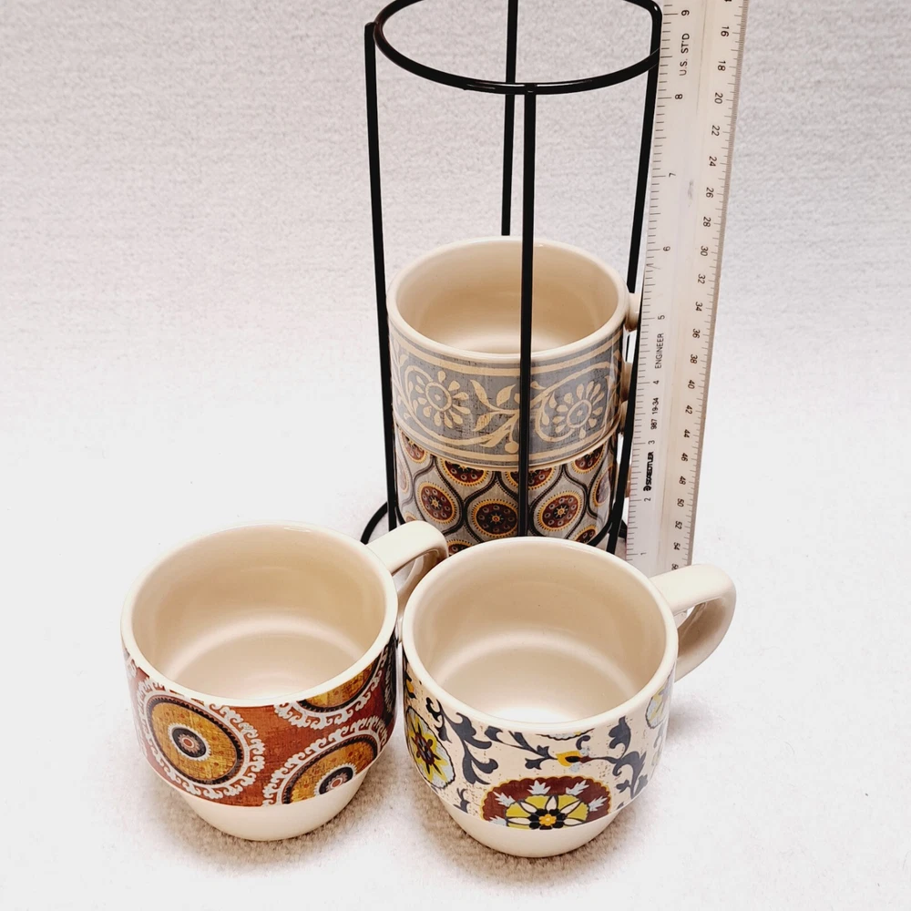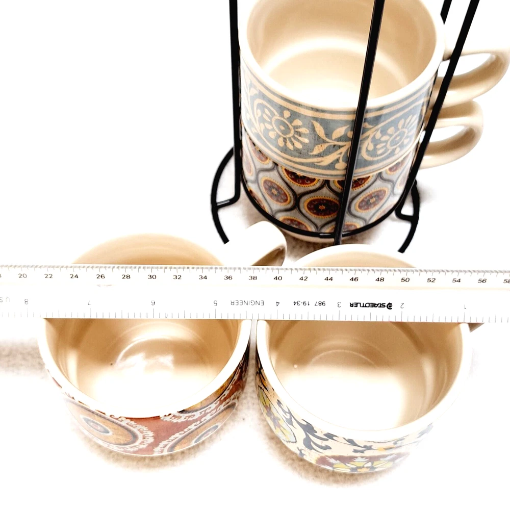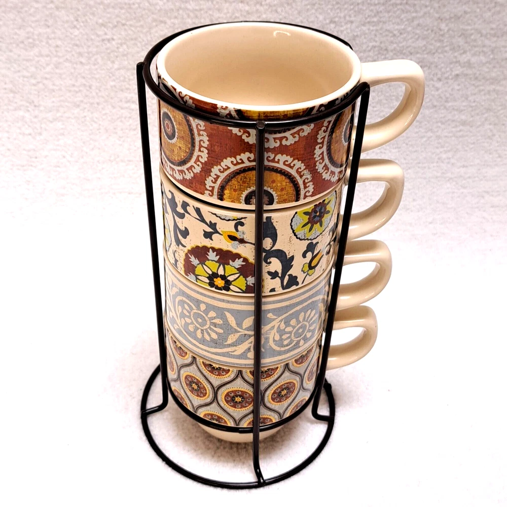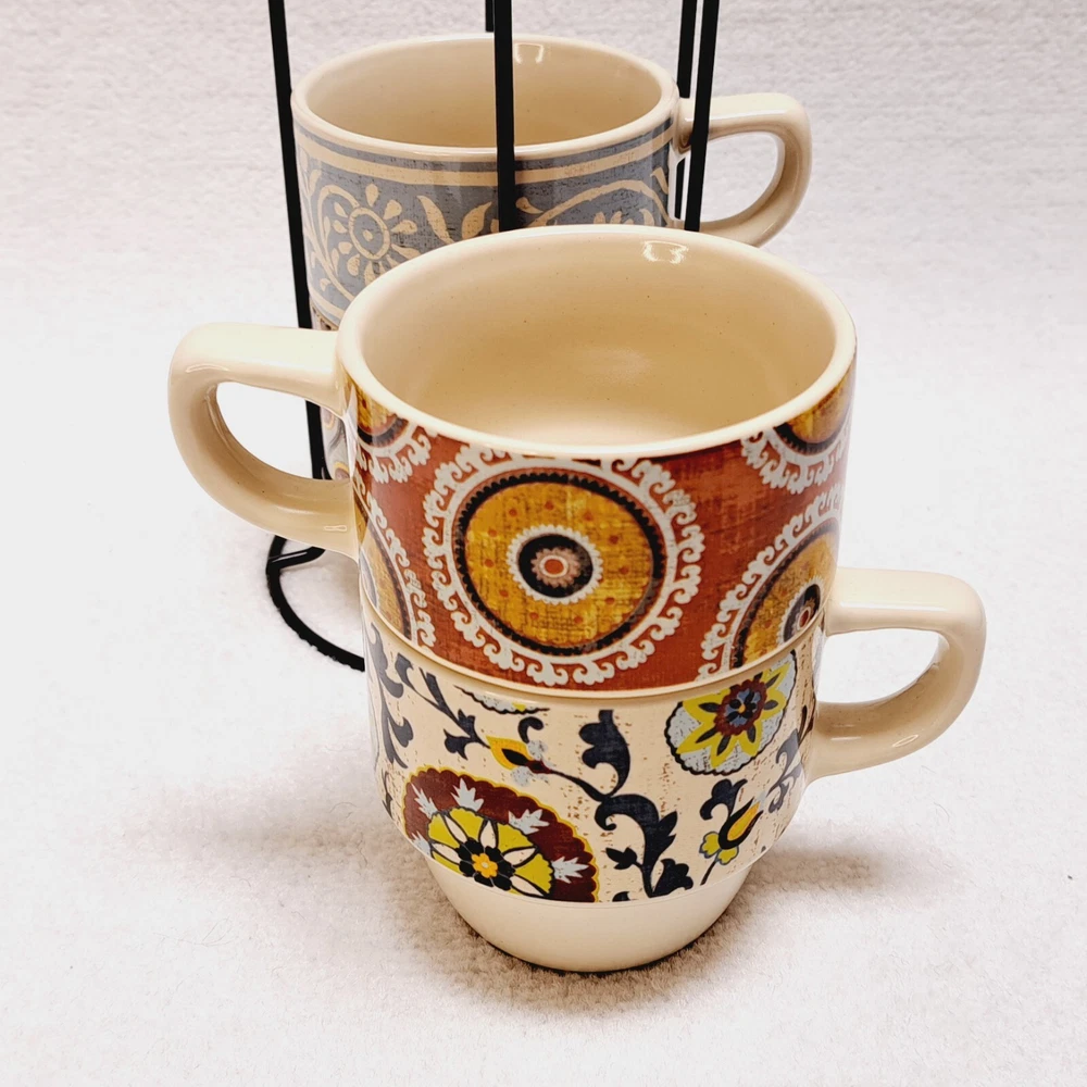 Add a touch of style to your coffee or tea time with this Pier 1 mug set. The set includes four ceramic mugs featuring a multicolor paisley pattern that adds a contemporary twist to your kitchen. The mugs are stackable, making storage simple. They also come with a round black vertical rack for easy storage. Each mug holds up to 8 fl oz and measures 3 inches deep. This coffee tea mug set is perfect for all occasions and can be personalized if desired.