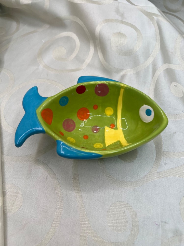 This is a Pier 1 Imports ceramic bowl featuring a green polka dot design with a fish theme. It is suitable for all occasions and can be used for serving sauces or dips. The bowl is crafted using art pottery techniques in China.