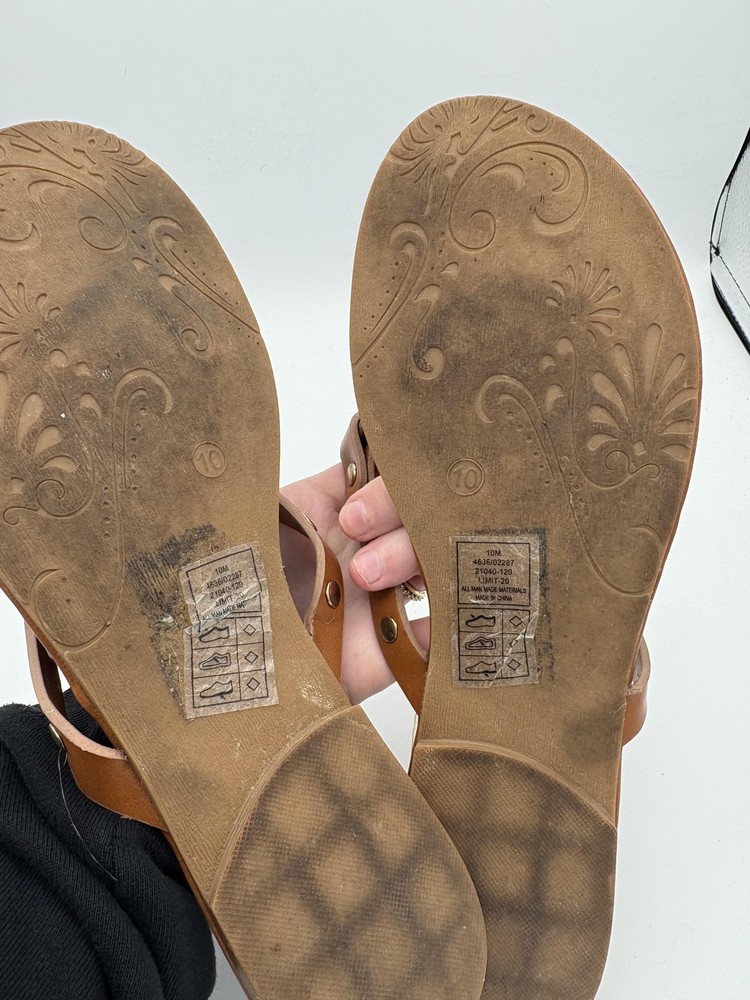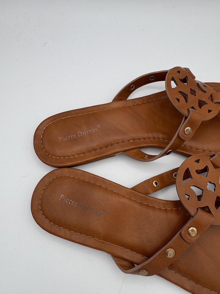 Brand: Pierre Dumas Item: Womens thong sandals with flat sole and decorative cutout medallion upper. Color: Brown upper and footbed with gold tone stud hardware and matching brown outsole. Gender/Size: Womens US size 10M; size equivalents include UK 8, EU 41, and AU 10. Material: Synthetic upper and lining with man made outsole and all man made materials construction. Design details: Round laser cut medallion at vamp with toe post, slim side straps with rivet studs, stitched footbed, and textured floral pattern outsole. Style/Model: Pierre Dumas thong sandals with medallion and stud accents. Tag details: Outsole label notes size 10M, all man made materials, and Made in China with material icons. Occasion/Use: Suitable for casual wear, summer outfits, beach trips, and everyday warm weather walking. Notes: Easy slip on thong sandals with neutral brown color and flat comfortable design.
