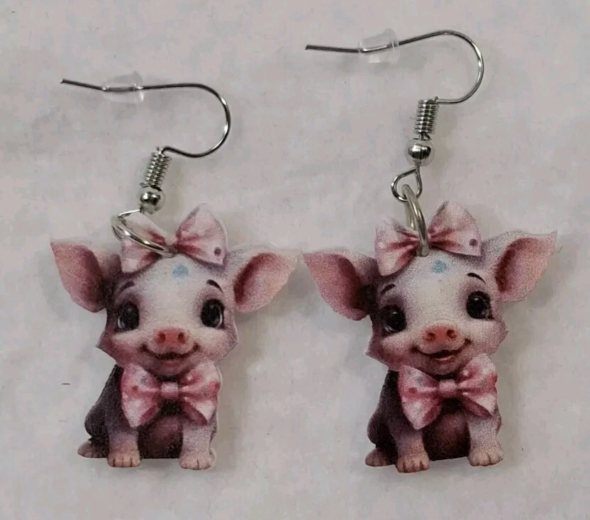 Dangle Charm Piggy Mom Gift Farm Pig Earrings Piglet Fashion Jewelry See photos for measurements Acrylic - lightweight Design on one side Please view all photos zooming in on them as they are part of the description for you to judge condition.