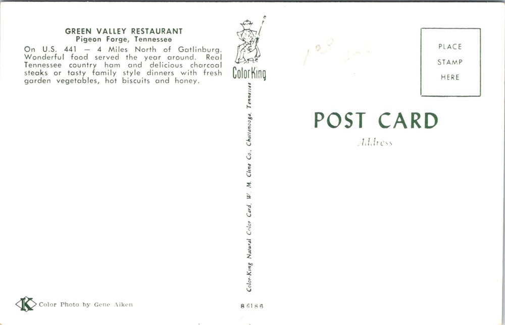 Pigeon Forge Tennessee Green Valley Restaurant Vintage Postcard 23608 Front of Card: The image shows a building with a rustic design, featuring stone walls and a sloped roof. The building is a restaurant named "Green Valley Restaurant," as indicated by the large sign on the right side of the image. The sign also advertises "FAMILY STYLE SPECIAL DINNERS," "TROUT," and "RIB STEAK." Another sign below reads "GREEN VALLEY GOOD FOOD" and "OPEN 6 a.m. to 10 p.m." The restaurant is situated in a parking lot with several empty parking spaces visible in the foreground. The sky is clear with a few clouds, suggesting a sunny day. The overall appearance of the restaurant and its signage gives a welcoming and homey vibe, making it an interesting place for dining. Back of Card: The image shows the back of a postcard from the Green Valley Restaurant in Pigeon Forge, Tennessee. The postcard includes a description of the restaurant's location and offerings. The text reads: "GREEN VALLEY RESTAURANT Pigeon Forge, Tennessee On U.S. 441 — 4 Miles North of Gatlinburg. Wonderful food served the year around. Real Tennessee country ham and delicious charcoal steaks or tasty family style dinners with fresh garden vegetables, hot biscuits and honey." There is also a small illustration of a chef with the text "ColorKing" next to it. The bottom left corner has the text "Color Photo by Gene Aiken," and along the left edge, it says "Color-King Natural Color Card, W. M. Cline Co., Chattanooga, Tennessee." The number "86186" is printed at the bottom. The right side of the postcard has a designated area for a stamp and address, with the words "PLACE STAMP HERE" and "POST CARD" printed.
