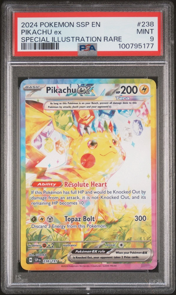 brand:The Pokémon CompanyLanguage:EnglishAdditional Description:Pikachu exAttack #1:[G][L][M] Topaz Bolt (300)Manufacturer:The Pokémon CompanyGame:Pokémon TCGCard Name:Pikachu ExCard Number:238/191Weakness:x2 [F]Card Type:PokémonStage:BasicRarity:Special Illustration RareHP:200Card Text:Ability: Resolute Heart If this Pokémon has full HP and would be Knocked Out by damage from an attack, it is not Knocked Out, and its remaining HP becomes 10.Speciality:EXSet:Sv08: Surging SparksRetreat Cost:CFinish:Holo