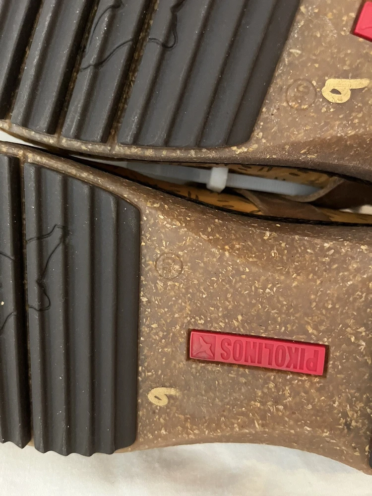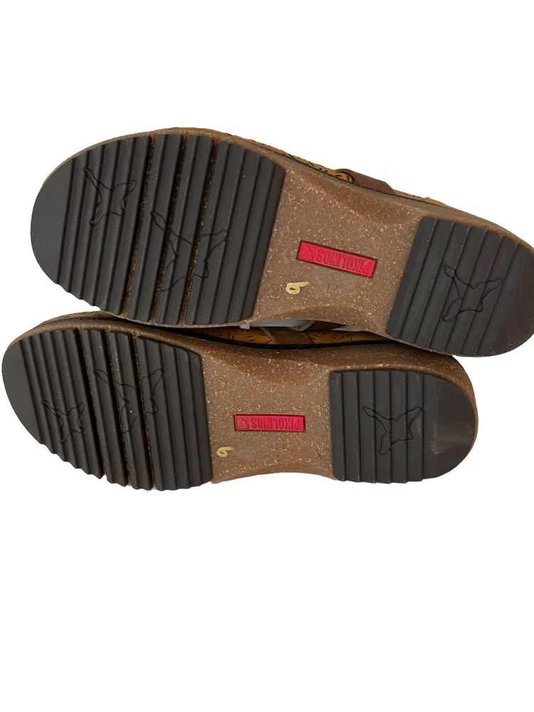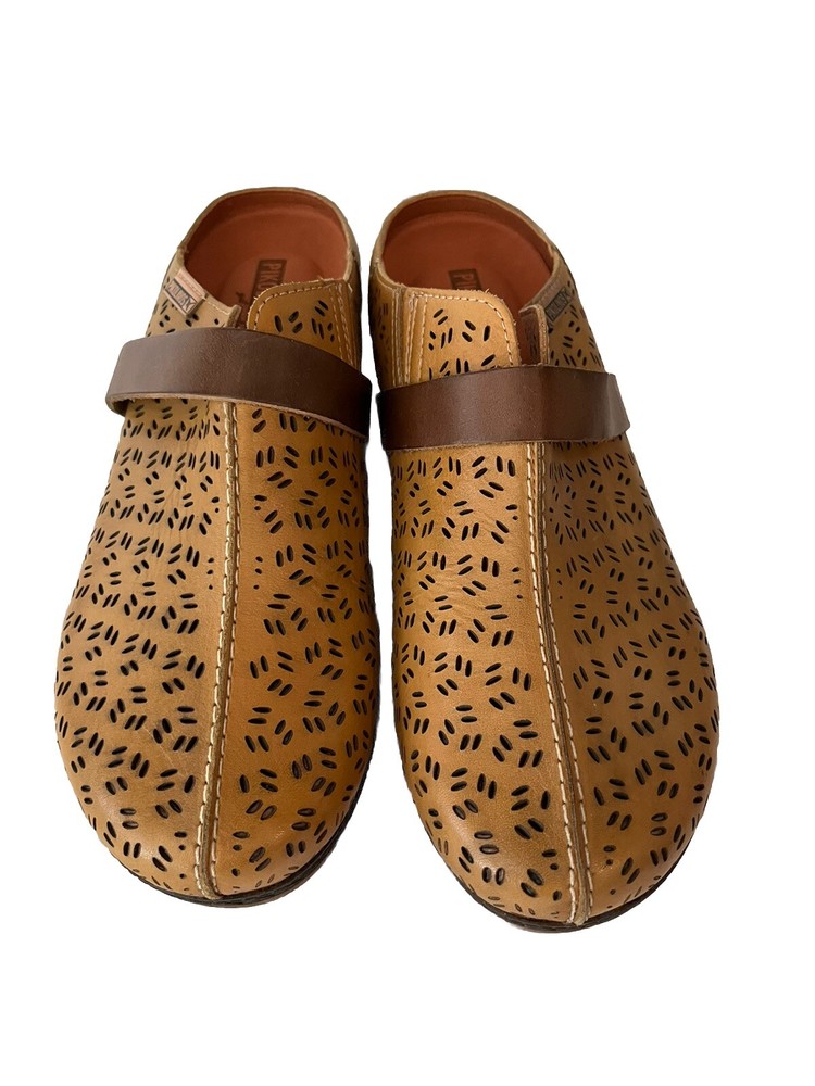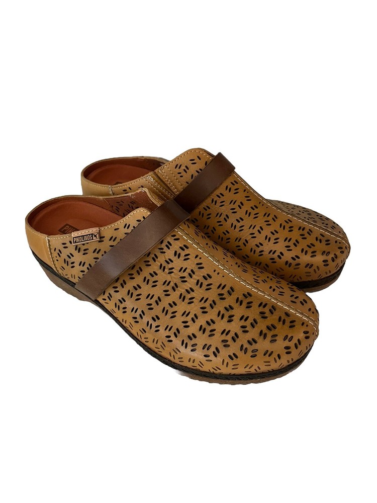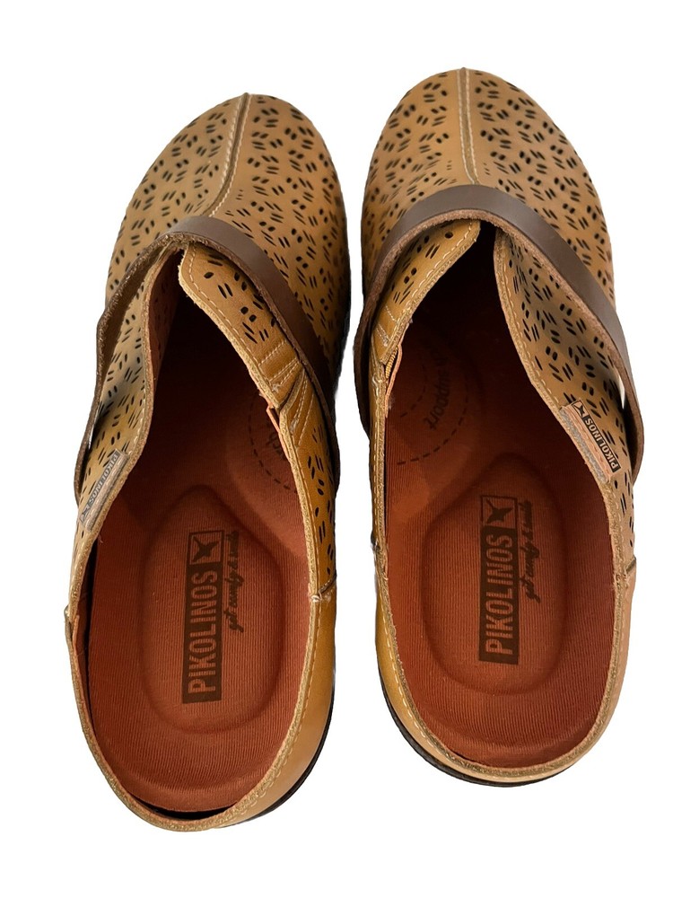 Step into comfort and style with these Pikolinos Die Cut Granada clog mules. The slip-on design with a round toe shape and low wedge heel style makes them perfect for travel and casual occasions. The honey color and bohemian theme add a touch of classic style, while the memory foam insole and arch support provide cushioned comfort. These shoes feature a strap and logo accent, as well as a rubber outsole for durability. The Pikolinos brand is known for its quality and these shoes are no exception. They are available in women's US shoe size 9-9.5 and EU shoe size 40. Whether you're looking for a comfortable pair of shoes or a stylish addition to your wardrobe, these Pikolinos clog mules are a must-have. New without the box. Never worn First quality from hi end dept store Size 40 fits US 9-9.5