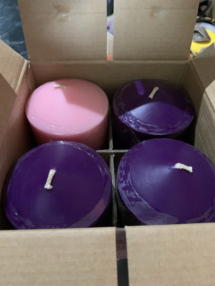 “All in my E-bay store for sale in one lot, over+$3K” Advent Christmas Treasures 3" x 3" Pilar Advent Candles. The purple and pink color