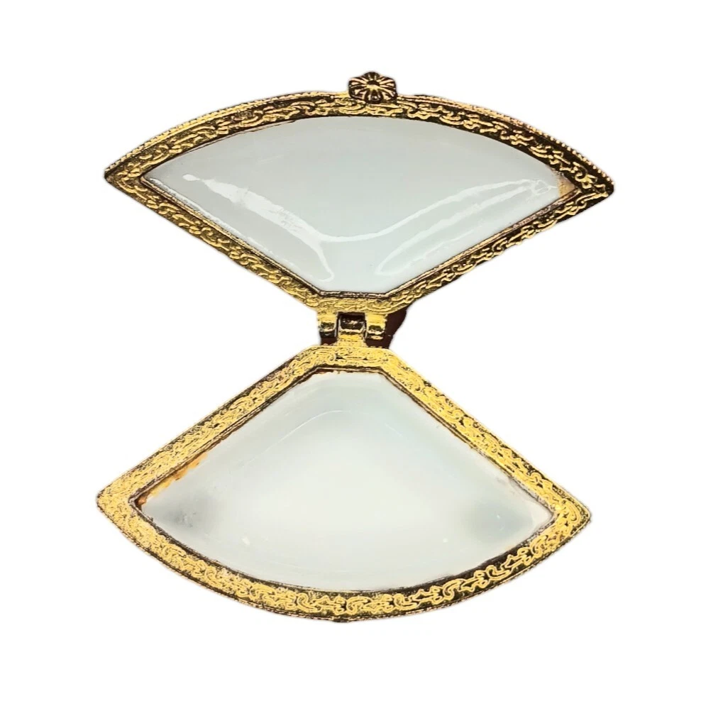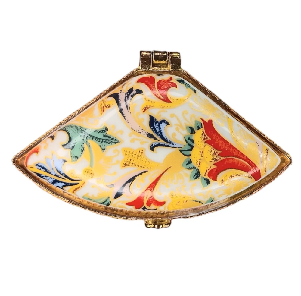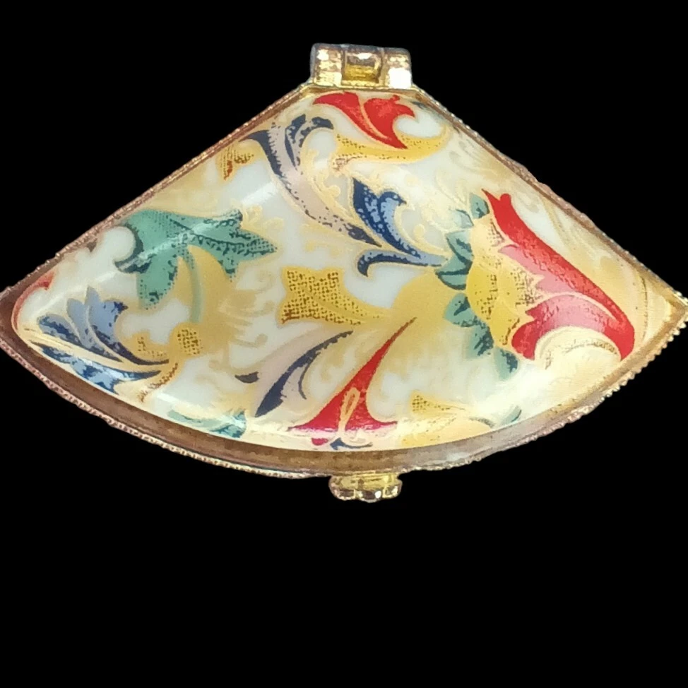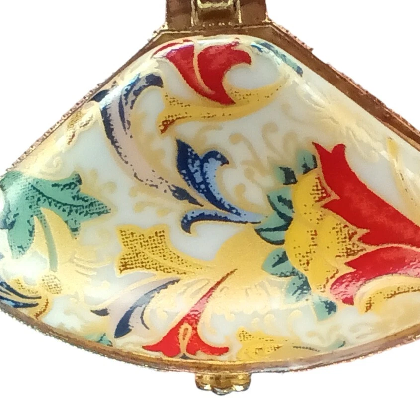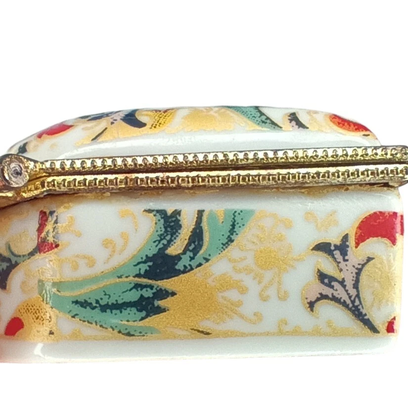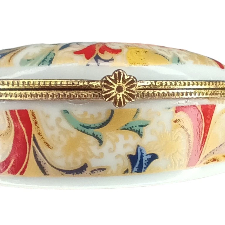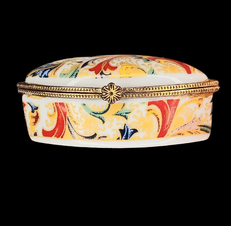 Porcelain Floral Paisley Hinged Ceramic Pill Box Trinket Box Red Yellow Gold Approximately 1" x 2.5" Excellent condition
