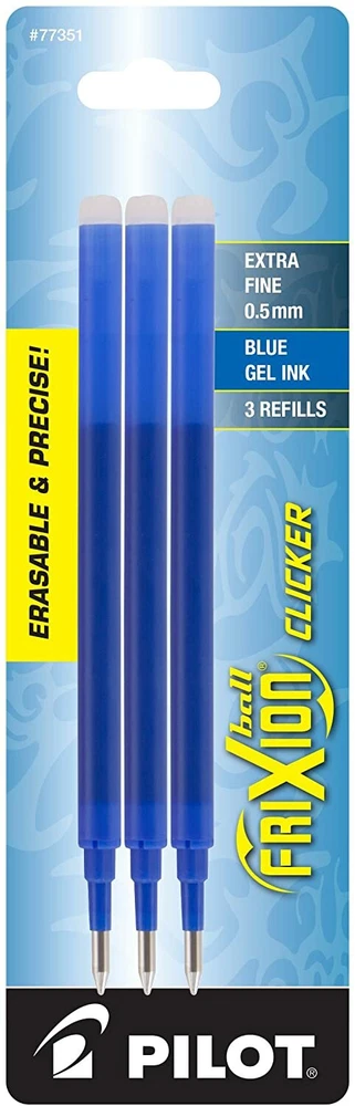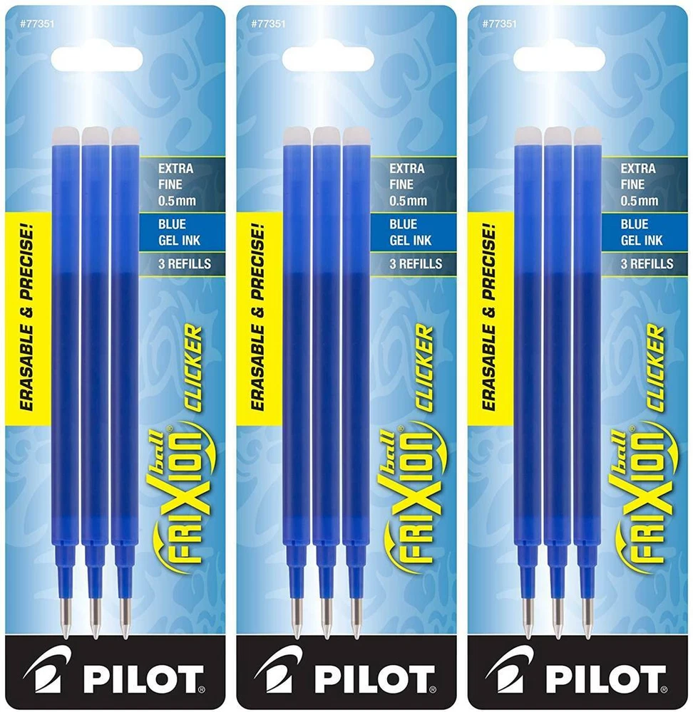 Pilot's high quality refills and accessories extend the life of Pilot products, creating ultimate value; an economic and environmentally-friendly option. Point Type: FriXion Ball, Extra Fine 0.5mm Wrote smoothly and erased cleanly Smooth, mistake-free writing benefits teachers, students, parents, and professionals alike. Each pack includes 3 refills. Sold as set of 3 Packs. Refill fits the following pens: FriXion Ball, FriXion Clicker and FriXion LX About FriXion Erasable Pens by Pilot FriXion offers more than a pencil ever could! Unlimited do-overs allow you to write, erase, and rewrite repeatedly without damaging your documents. The eraser tip won't wear down or leave crumbs behind. No one will know it wasn't perfect the first time! FriXion Erasable Pens are available in a variety of colorful inks and point sizes that are great for making lists and staying organized.