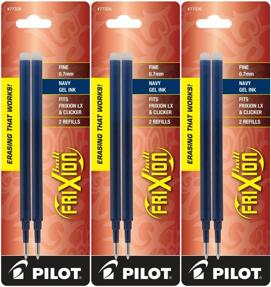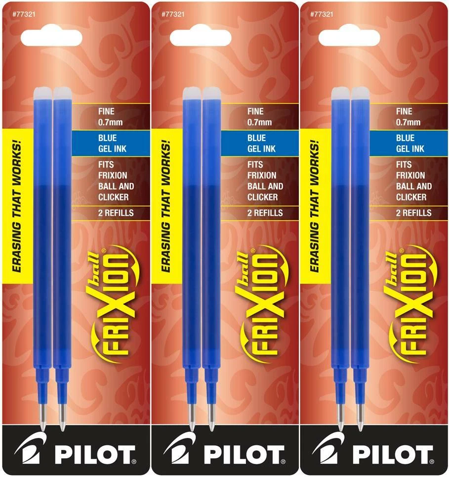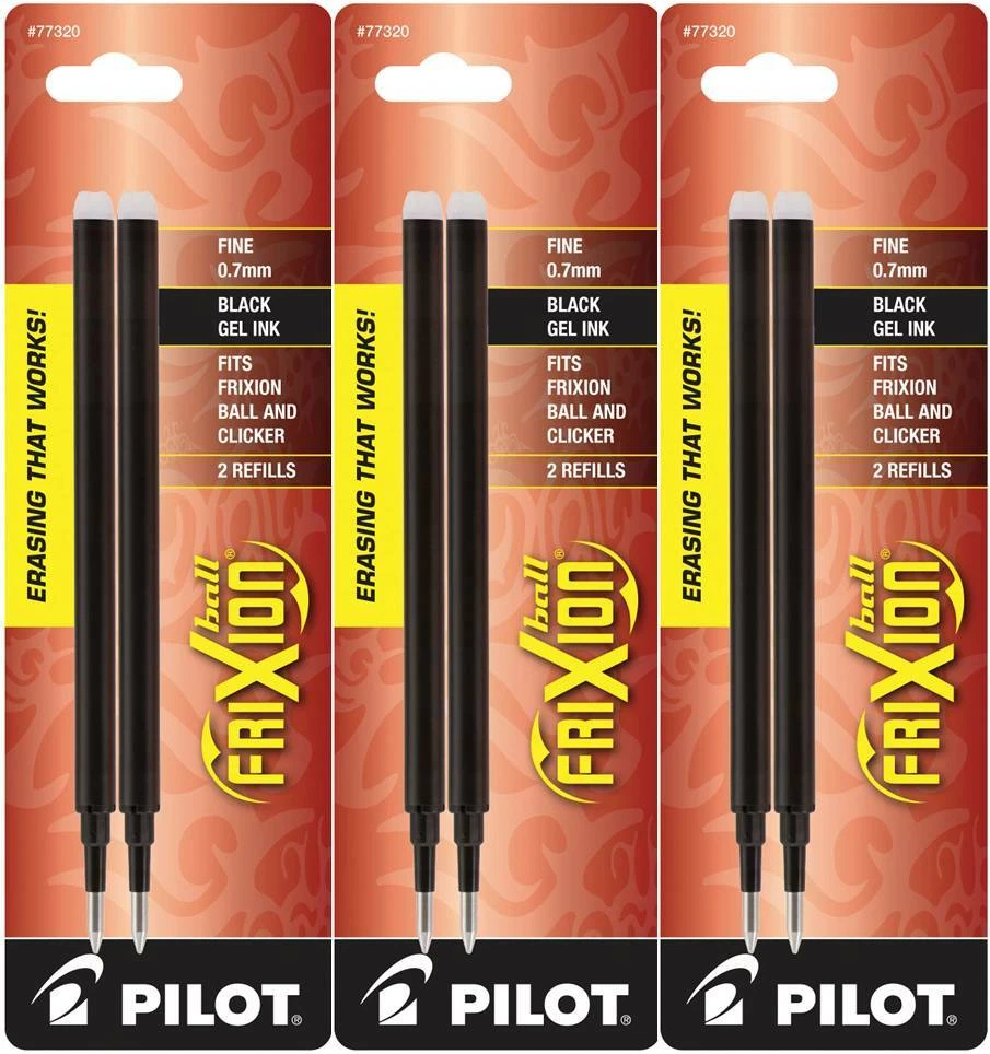 Pilot's high quality refills and accessories extend the life of Pilot products, creating ultimate value; an economic and environmentally-friendly option. Point Type: Fine 0.7mm Wrote smoothly and erased cleanly Smooth, mistake-free writing benefits teachers, students, parents, and professionals alike. Each pack includes 2 refills. Sold as set of 3 Packs. Refill fits the following pens: FriXion Ball, FriXion Clicker and FriXion LX About FriXion Erasable Pens by Pilot FriXion offers more than a pencil ever could! Unlimited do-overs allow you to write, erase, and rewrite repeatedly without damaging your documents. The eraser tip won't wear down or leave crumbs behind. No one will know it wasn't perfect the first time! FriXion Erasable Pens are available in a variety of colorful inks and point sizes that are great for making lists and staying organized.