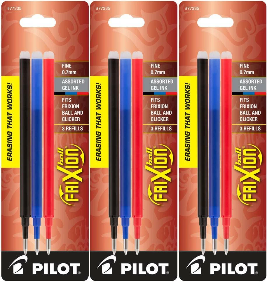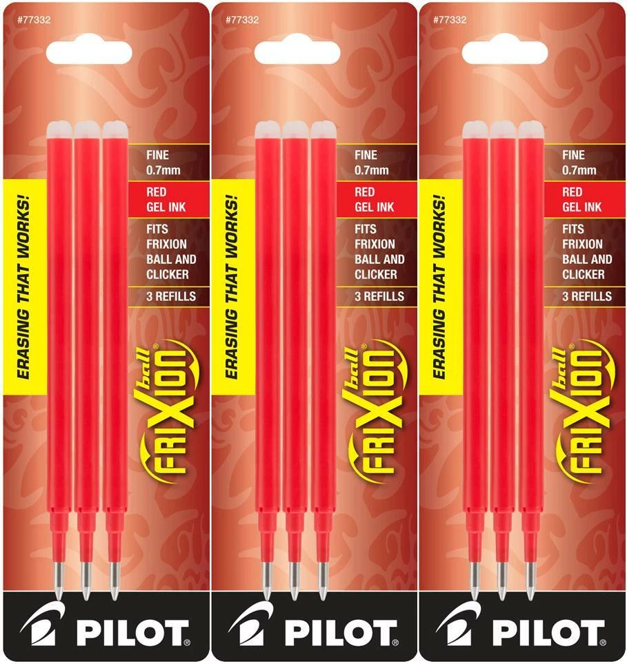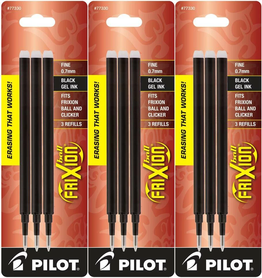 Pilot's high quality refills and accessories extend the life of Pilot products, creating ultimate value; an economic and environmentally-friendly option. Point Type: Fine 0.7mm Wrote smoothly and erased cleanly Smooth, mistake-free writing benefits teachers, students, parents, and professionals alike. Each pack includes 3 refills. Sold as set of 3 Packs. Refill fits the following pens: FriXion Ball, FriXion Clicker and FriXion LX About FriXion Erasable Pens by Pilot FriXion offers more than a pencil ever could! Unlimited do-overs allow you to write, erase, and rewrite repeatedly without damaging your documents. The eraser tip won't wear down or leave crumbs behind. No one will know it wasn't perfect the first time! FriXion Erasable Pens are available in a variety of colorful inks and point sizes that are great for making lists and staying organized.