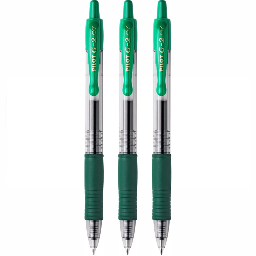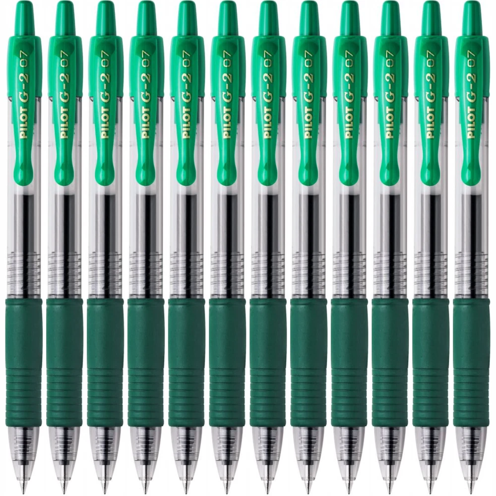Pilot G2 07 Retractable Rollerball Gel Ink Pen 0.7mm GREEN INK SET Orders placed before 3pm Monday - Friday are dispatched the same working day. The iconic and best-selling retractable gel pen from Pilot. Favoured worldwide by professionals and the public alike, the smooth gel ink provides a blob-free and vivid writing experience from start to finish. With over thirty exciting colours to choose from, there's a G207 for every occasion, and with refills available, this is truly a pen that will stay with you for years. The cushioned ergonomic grip and smooth curves of the pocket clip give the pen a simple yet elegant finish that fits in the pocket, pencil case or hand with equal ease, letting you simply write. 0.7mm tip gives a 0.39mm medium line. **Please note - the pen/pens are delivered loose.** Why buy the Pilot G-207 Retractable Gel Rollerball Pen? Green ink Refillable using Pilot BLS-G2-7 refills 0.7mm tip gives a 0.39mm medium line Retractable tip: a pen ready in one click, no more cap lost! The ink colour is the same as the pen/barrel colour selected Refillable products are more economical and respectful of the environment Smooth gel ink provides a blob-free and vivid writing experience from start to finish An ergonomic pen with a rubber grip to ensure better control and better writing comfort! Effectiveness and writing comfort thanks to the unique fluidity and ultra-softness of the Pilot gel ink