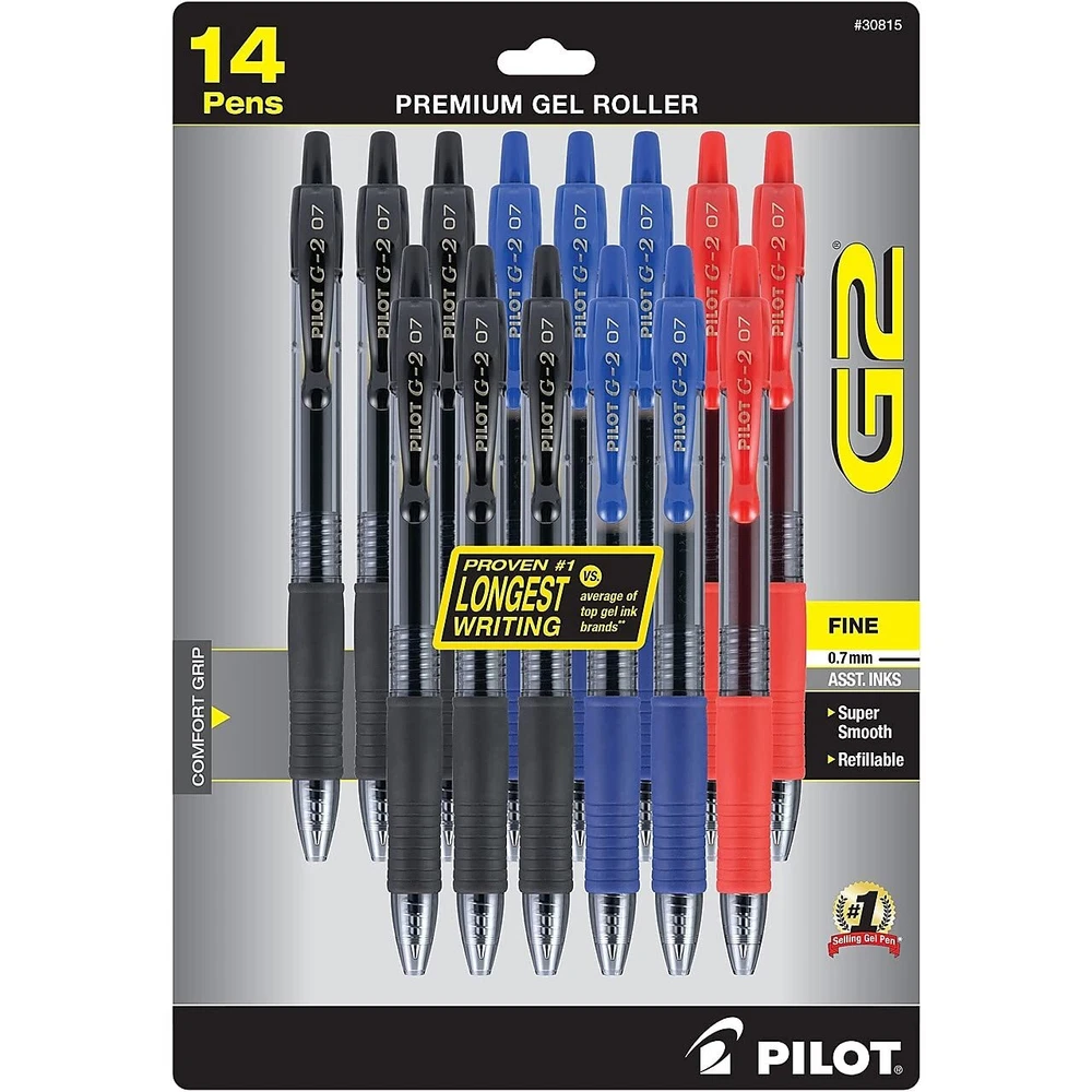 From taking notes to journaling or drawing, G2 Gel Roller pens keep the ink and your ideas flowing. These long-lasting pens come in many color options and 4 tip sizes, so it's easy to find one that caters to your writing needs and personal style. The quick-drying ink prevents smears and smudges, ensuring your work is neat and clear. Create masterpieces of writing or art with these thanks smooth-flowing gel pens that deliver vivid and clear lines. Perfect for your everyday writing needs, the 0.7 mm fine pen point size strikes a balance between fine and bold lines. Archival-safe and acid-free black and blue pens are formulated to be long-lasting and fade-resistant, ensuring your documents last for a long time. The comfortable rubber grip offers ergonomic support, reducing hand fatigue and making lengthy writing projects a breeze. Pilot's G2 line blends smooth writing with long-lasting ink, precision and comfort for an exceptional writing experience. Smooth & Long-lasting: Enjoy a smooth writing experience thanks to the gel ink that glides effortlessly across paper; G2 has been proven to be the longest-lasting gel ink pen that allows you to write more (Data on File) Comfortable Grip: A contoured rubber grip provides ergonomic support, making long writing projects easier; 14-pack includes 6 black, 5 blue and 3 red pen(s) Versatile: Perfect for everyday writing tasks such as taking notes and jotting down grocery lists; The G2 tip delivers crisp, clean lines ideal for writing, intricate designs, drawing, sketching or doodling Refillable & Quick Drying: Save money and reduce waste by reusing and refilling your retractable pen with Pilot G2 refills (sold separately); The vibrant, quick drying ink helps prevent smudges and smears Power to the Pen: Express yourself effortlessly with Pilot's line of innovative writing tools, including gel ink, erasable, rolling ball, ballpoint and fountain pens, & dry erase markers & more