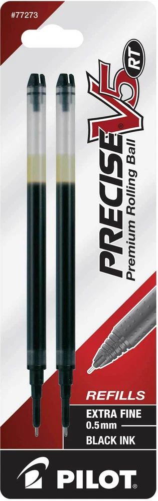 Pilot's high quality refills and accessories extend the life of Pilot products, creating ultimate value; an economic and environmentally-friendly option. Point Type: Extra Fine 0.5mm Smooth and skip-free writing Delivers precise and clean lines 3 colors available for extra fine point Each pack includes 2 refills. Sold as set of 3 Packs. Refill fits the following pens: Precise V5 RT retractable . About Precise V5/V7/V10 RT Pens There is a fine line between good and great and that line is drawn with Pilot Precise. Precise rolling ball retractable pens are designed to deliver the same kind of premium, precision writing experience as the capped version. Precise combines Pilot's exceptionally smooth writing ink, premium metal accents, and comfortable grip for a go anywhere sophisticated writing experience. Precise is ideal for those who prefer retractable pens and demand superior writing performance. Precision tip delivers a precise, clean line every time Retractable convenience with sophisticated metal clip Patented Precision Point Technology for smooth, skip-free writing Rubber grip with traction pockets Airplane safe system Refillable