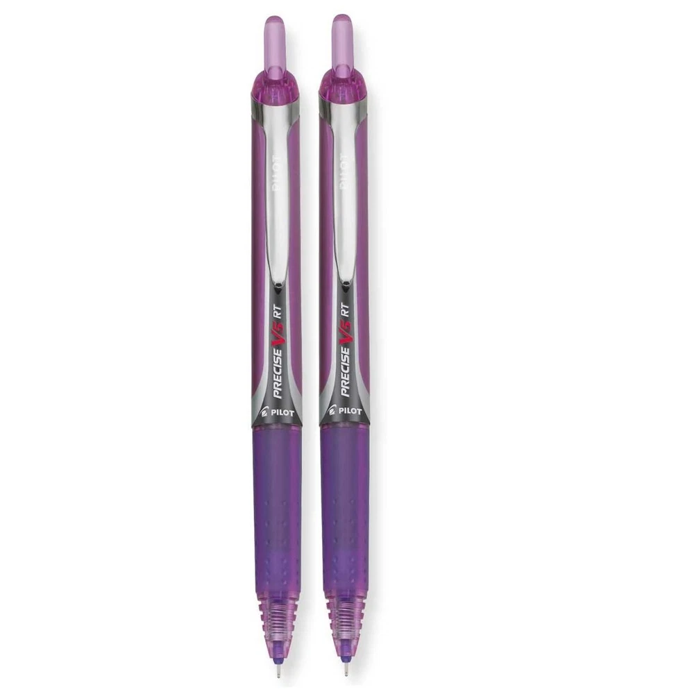 Show up ready to write with these Pilot pens. Flaunting a versatile design thats built to perform both in school and at the office, each pen supplies skip-resistant ink for clean, clear markings. Once you are ready to head home, just retract the tip to prevent unwanted marks in your pocket or briefcase. Skip-resistant liquid ink formula for consistent coverage on most types of paper. Retractable design for convenient use. Comfort-grip barrel has traction pockets and a tapered design for a natural feel. Refillable. Includes a pack of 12 Precise liquid ink pens in purple. These retractable pens purple ink provides a burst of color to your notes and doodles. Retractable and refillable version of the Precise V5 Pen - Pilot refill model #77273 and #77274 sold separately Incredibly smooth, skip-free writing and rubber grip with traction pockets Visible ink supply lets you see how much ink is left Extra fine point (0.5mm) for precise writing Sold as: 2 Packs of - 1 - / - Total of 2