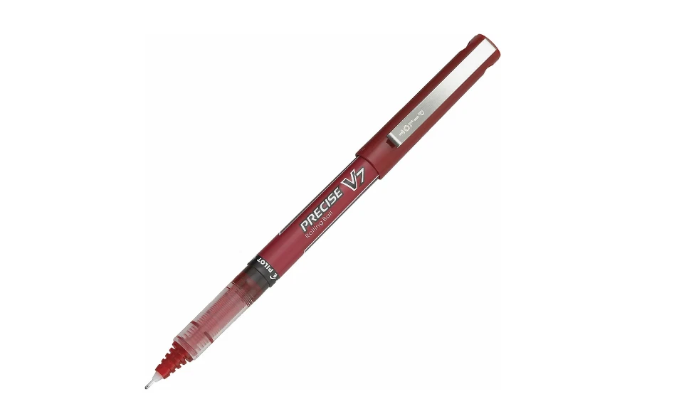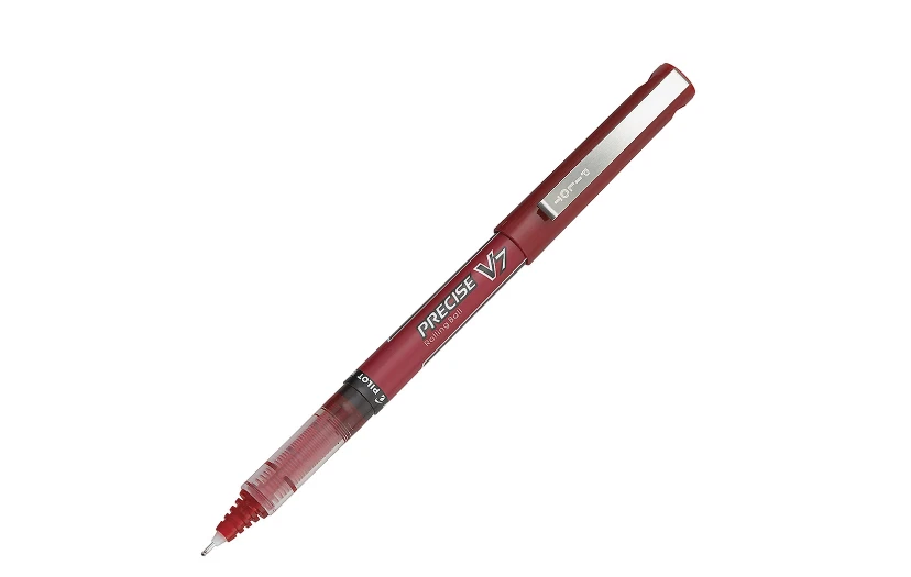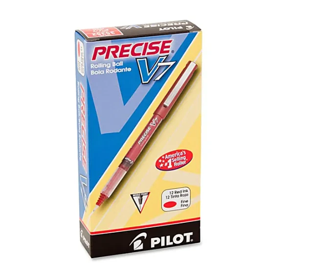 Precise liquid ink pens include needle points that ensure crisp, clean strokes of smooth, neat ink that won't skip. The contoured grips of these Pilot pens provide greater control and comfort, preventing fatigue during long writing sessions. Innovative liquid-ink formula maintains consistent flowing strokes as you write. The advanced ink-feed system of the V7 ink pens also helps deliver smooth, skip-free writing. Long-lasting visible ink supply. See-through barrel window lets you know how much ink is left. Contoured grip for comfort. Barrel conveniently tapers toward the base so your fingers enjoy a more natural hold. Patented precise needle-point technology to write in the smallest of spaces with the V7 liquid ink pens. Great for writing notes in page margins or detailing labels, dividers and file folders. Nonrefillable. These 0.7 mm red ink pens come in a 12-pack. Point Size 0.7 mm Color (Barrel) Red Point Type Fine Color (Ink) Red Quantity 12 Number Of Packs/Boxes 1 Erasable No Grip Type Contoured Ink Type Liquid Refillable No