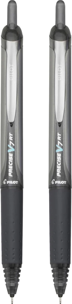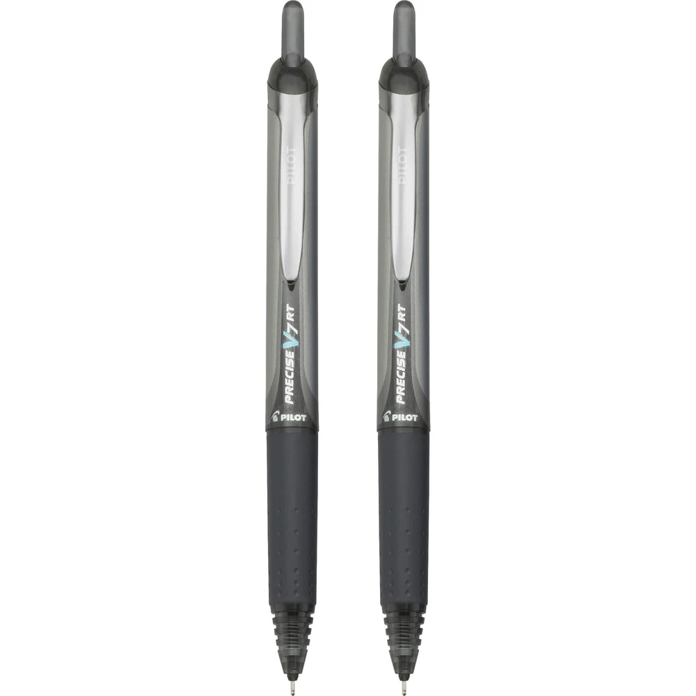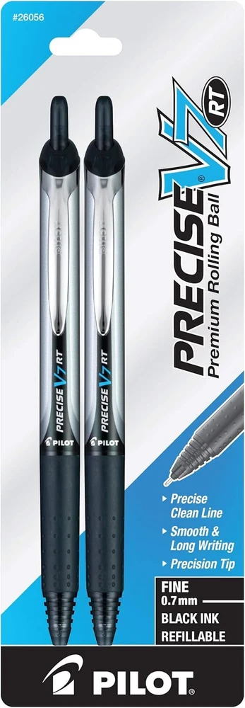 Product Description Pilot Precise V7 RT Pens, (26056) Fine Point, 0.7 mm, Rolling Ball, Black Ink, 2 Count, (Pack Of 1) There is a fine line between good and great and that line is drawn with Pilot Precise V7 RT. Precise V7 RT rolling ball pens combine Pilot's smooth writing ink, premium metal accents, and iconic look in order to deliver a premium, sophisticated writing experience. Precise V7 RT is for writers in need of a superior writing performance. V7 Premium Rolling Ball pen from Pilot - America's #1 Selling rolling ball pen brand. Precise V7 delivers unparalleled performance for ultra-smooth, fine point precision writing. Pilot's unique liquid ink formula is paired with patented Precision Point Technology to deliver consistent flowing strokes for a truly exceptional, skip-free writing experience. The fine point 0.7mm writing tip is a great choice for everything from keeping to-do lists perfectly organized to creating detailed drawings. Retractable option available in Black, Blue Red, and Purple ink colors. Point size: 0.7mm; Point Type: Fine; Ink Color(s): Black; Pen Type: Rolling Ball; 2 Count PILOT PRECISE V7 RT: This premium retractable rolling ball pen has a patented fine precision tip to deliver smooth, skip-free writing every time. Unparalleled performance for ultra-smooth writing. PRECISION POINT: You'll love the clean lines & smooth ink delivery of this retractable rolling ball pen. Available in black, blue, red, & purple ink. Features a sophisticated metal clip. DESIGNED TO DELIGHT: If you love Pilot Precise pens, you'll want to try the full line of Precise V5, V5 Deco Collection, & V7 rolling ball pens, available in capped & retractable options. TRUSTED QUALITY: We've been making pens for over 100 years. Whether you're taking notes, stocking up on school or office supplies, or writing in a bullet journal, Pilot has the perfect pen for you! POWER TO THE PEN: Pilot makes exceptional writing instruments to suit all your needs. We have fountain, ballpoint, retractable, erasable & gel ink pens, whiteboard markers & more for every writing style. Precise V7 RT Premium Rolling Ball pens offer unparalleled performance and smooth, precision writing Precise's unique liquid ink formula and Patented Precision Point Technology delivers a silky, skip-free writing experience The fine writing tip is ideal for any detail-driven writing task Attractive, retractable design for added convenience. Fine Point (0.5mm). Black Ink. 2 Count Precision tip that delivers a precise, clean line every time Unique liquid ink formula helps maintain consistent flowing strokes Incredibly smooth, skip-free writing Rubber grip with traction pockets Patented Precision Point Technology