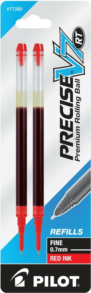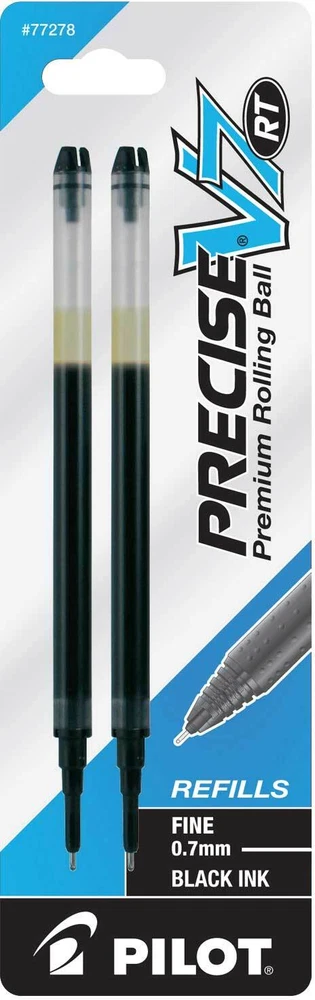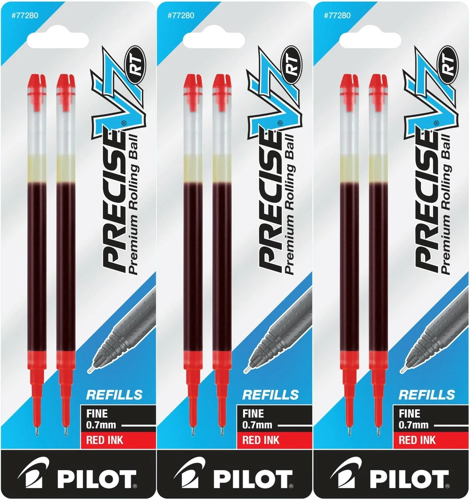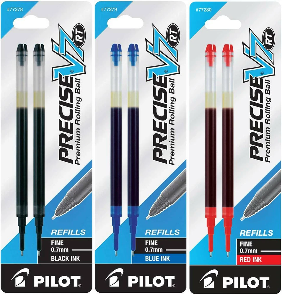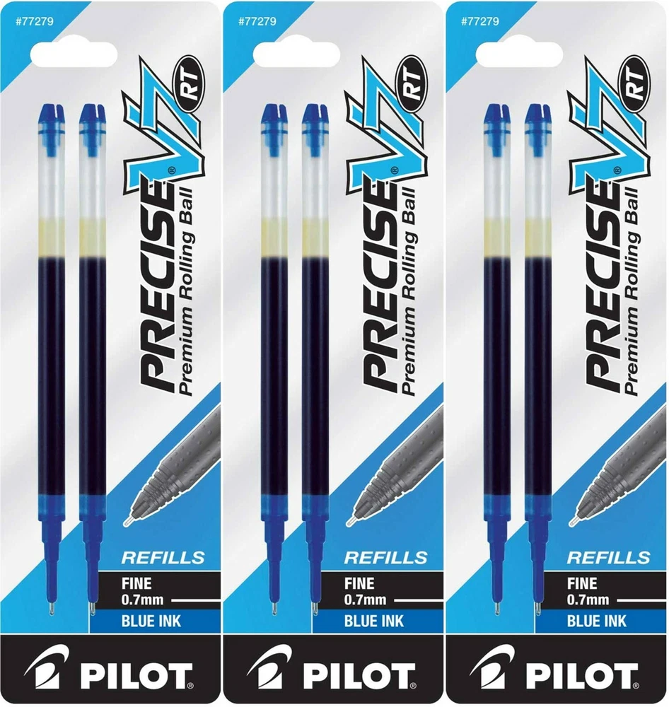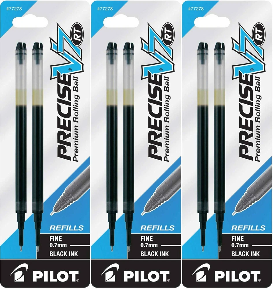 Pilot's high quality refills and accessories extend the life of Pilot products, creating ultimate value; an economic and environmentally-friendly option. Point Type: Fine 0.7mm Smooth and skip-free writing Delivers precise and clean lines 3 colors available for fine point Each pack includes 2 refills. Sold as set of 3 Packs. Refill fits the following pens: Precise V7 RT retractable . About Precise V5/V7/V10 RT Pens There is a fine line between good and great and that line is drawn with Pilot Precise. Precise rolling ball retractable pens are designed to deliver the same kind of premium, precision writing experience as the capped version. Precise combines Pilot's exceptionally smooth writing ink, premium metal accents, and comfortable grip for a go anywhere sophisticated writing experience. Precise is ideal for those who prefer retractable pens and demand superior writing performance. Precision tip delivers a precise, clean line every time Retractable convenience with sophisticated metal clip Patented Precision Point Technology for smooth, skip-free writing Rubber grip with traction pockets Airplane safe system Refillable