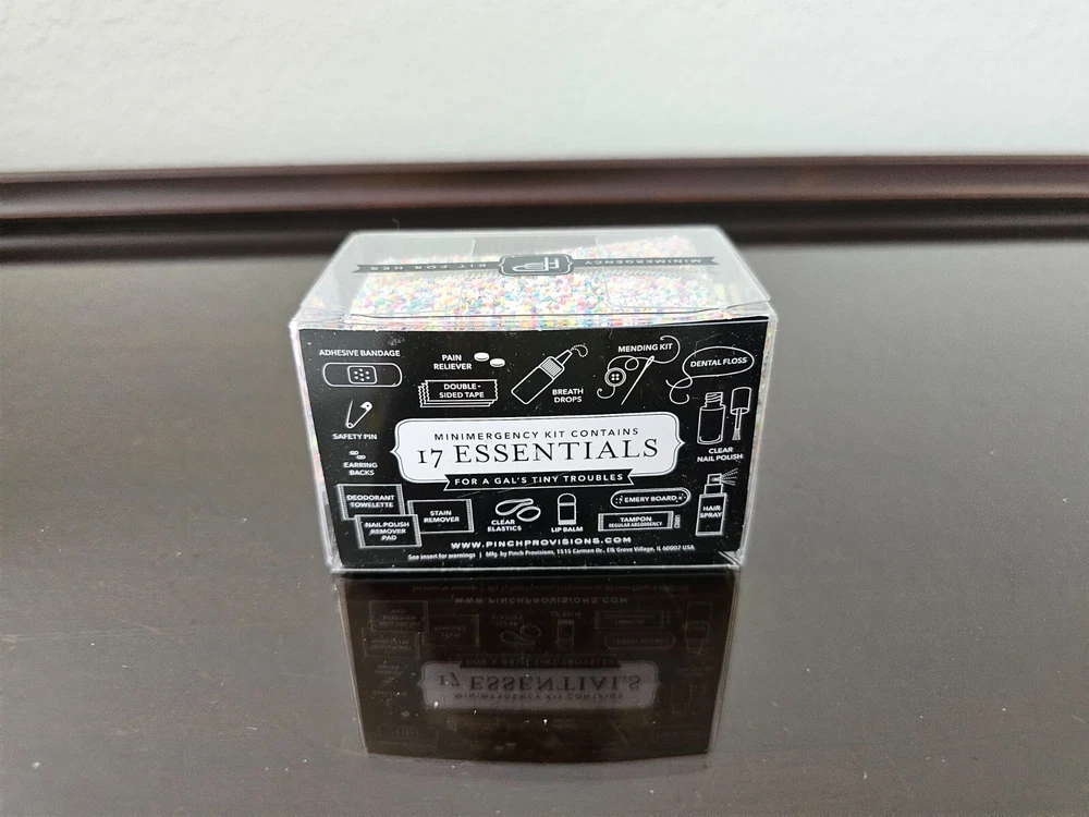 Francesca's Pinch Provisions Minimergency Kit For Her 17 Beauty & Personal Care Essentials. Includes: Adhesive Bandage Pain Reliever Double-Sided Tape Breath Drops Mending Kit Dental Floss Safety Pin Earring Backs Deodorant Towelette Nail Polish Remover Pad Stain Remover Clear Elastics Lip Balm Emery Board Tampon Clear Nail Polish Hair Spray