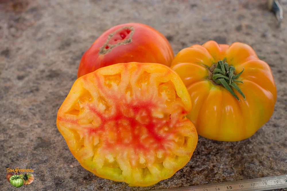 Pineapple Tomato (Lycopersicon esceluntum) is a unique bi-colored beefsteak tomato that will grow to be 1-2 lbs. Excellent slicing tomato with low acidity and mild citrusy undertones. Golden orange and red marbled skin with a red star-burst surprise in the center once sliced. One of the most popular heirloom beefsteaks Germination in 5-10 days, maturity in 85-90 days Collected: 7/24 Germination: 85% As always, FREE SHIPPING on all orders within the US Please, if you have any issues with your order, germination or simply need planting instructions, reach out to me and I will take care of you. I always take care of my customer
