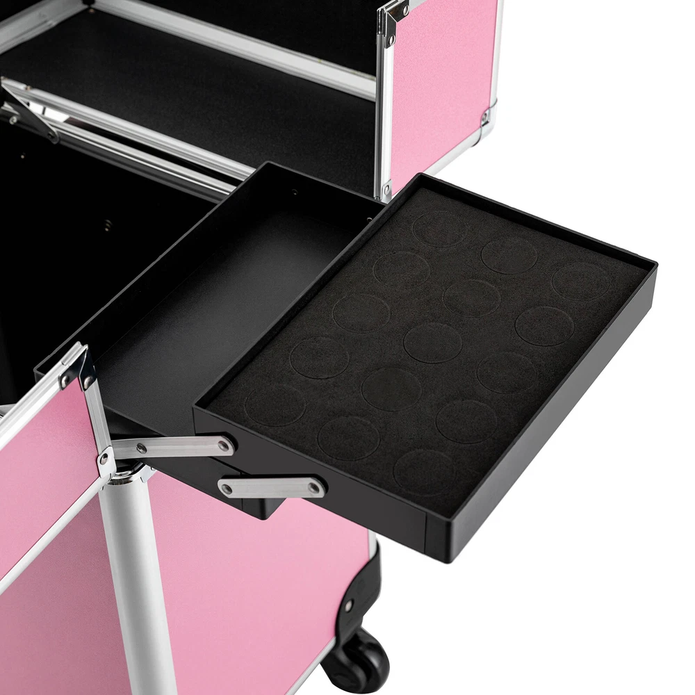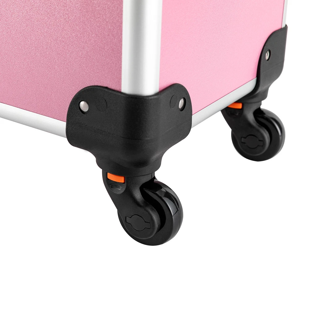 This pink rolling train case is a game-changer for makeup artists and beauty lovers! The sturdy aluminum alloy and ABS construction keeps everything secure, while the four spacious trays neatly organize all my cosmetics. The smooth universal wheels and retractable handle make it effortless to roll around, even fully loaded. The frosted finish gives it a sleek, professional look, and the latch opening ensures quick access. Perfect for travel or salon use—highly recommend for anyone who needs a durable, stylish, and ultra-functional cosmetic organizer!
