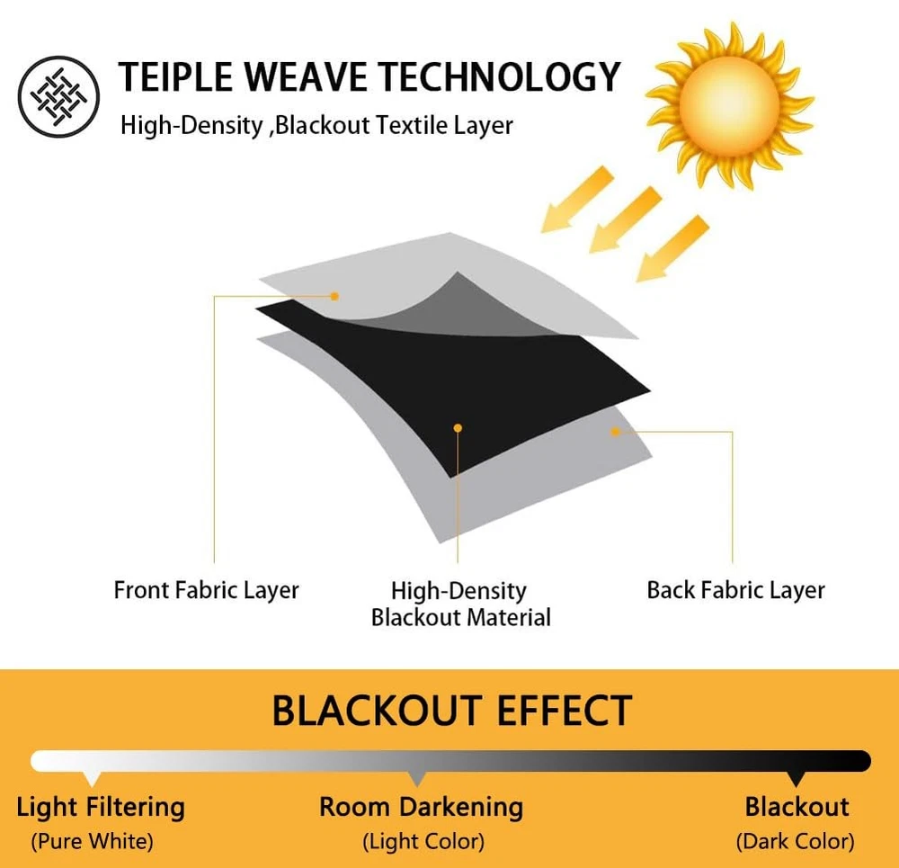 Blackout Curtain for Living Room, Grommet Thermal Insulated Curtain for Bedroom, Amazing Triple Weave Room Darkening Curtain, 1 Panel Amazing Triple Weave Fabric: These soft and durable window curtains adopt special triple weave technology. The black light-blocking yarns are woven between the two colored yarns. Our light blocking curtain with no liner, both side are the same color. Package Detail: Each package include 1 curtain panel. Each panel measures 42 inch wide by 72 inch long and has 6 premium anti-rust grommets on the top. For better fullness, the combined width of panels should be 1.5 to 2 times the width of the curtain rod Privacy & Light Blocking: Curtains provide a safe and private home environment for you and your family. These room darkening curtains also make your bedroom not to be flooded with light in early morning, bring you a good sleep Energy Saving: These curtains help to resist cold drafts in winter and block the cool conditioning air from escaping in summer, save spend on heating and cooling your home. These curtains are a perfect addition to bedroom, living room, kids room, nursery Easy Care: These blocks out curtains are machine washable, delicate cycle with mild detergent, tumble dry. Do not bleach. Wrinkles caused by packaging disappear after hanging for weeks or wash with cold water
