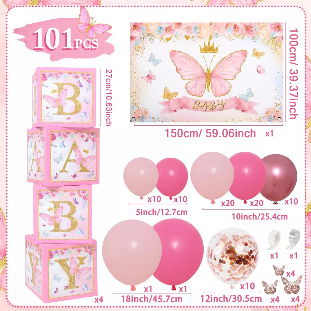 Pink Butterfly Baby Shower Decorations for Girl,Pink Balloon Garland Arch Kit,Pink Butterfly Baby Boxes and Butterfly Backdrop Kit for Baby Shower Butterfly Decorations Birthday Party Decor Pink Butterfly Mega Bundle-Great Value!With 101 different pink butterfly baby shower themed decorations, this amazingly large bundle has everything you need to host the baby shower you desire.Including 4pcs elegantly pink gold butterfly baby shower boxes,96pcs purple balloon garland arch kit and one pink butterfly backdrop banner. Premium Material-Pink butterfly baby shower boxes are made of environmental and durable paper,gold foil print and other non-toxic materials.Our pink butterfly balloons garland kit are made of high quality natural latex,safe and non-toxic,the leather is thick, not easy to burst,and the color is true.High-quality latex allows the balloon to stretch well when inflated.Our pink and gold butterfly background screen is made of heavy duty polyester fabric that is easy to clean, tear resistant and washable. Easy to Assemble-Baby shower "BABY" background picture on the rope and brass buckle design, easy for you to hang the background in your favorite place.You can use our instructions as a reference to easily install the balloon garland.You'll simply have to open the box, push the sides together and close it.You will get four sturdy baby shower boxes.It's all very simple, save time and enjoy the party with your guest. Suitable for Any Occasion-If you are carefully planning a butterfly themed party, baby shower for girl, baby girl birthday, 1st birthday, girl birthday party,gender reveal party,bridal shower,wedding,bachelorette or other party what you want! It will be your best choice. Beautiful pink and gold butterfly decor kit will light up your party. Buy it with confidence-We are committed to providing our customers with satisfactory products. We are very confident that our products are made with the high quality materials. If for any reason you are not completely satisfied with the pink butterfly baby shower decorations,please contact us promptly and we will give you a 100% refund - no questions asked. Pink Butterfly Mega Bundle-Great Value!With 101 different pink butterfly baby shower themed decorations, this amazingly large bundle has everything you need to host the baby shower you desire.Including 4pcs elegantly pink gold butterfly baby shower boxes,96pcs purple balloon garland arch kit and one pink butterfly backdrop banner. Premium Material-Pink butterfly baby shower boxes are made of environmental and durable paper,gold foil print and other non-toxic materials.Our pink butterfly balloons garland kit are made of high quality natural latex,safe and non-toxic,the leather is thick, not easy to burst,and the color is true.High-quality latex allows the balloon to stretch well when inflated.Our pink and gold butterfly background screen is made of heavy duty polyester fabric that is easy to clean, tear resistant and washable. Easy to Assemble-Baby shower "BABY" background picture on the rope and brass buckle design, easy for you to hang the background in your favorite place.You can use our instructions as a reference to easily install the balloon garland.You'll simply have to open the box, push the sides together and close it.You will get four sturdy baby shower boxes.It's all very simple, save time and enjoy the party with your guest. Suitable for Any Occasion-If you are carefully planning a butterfly themed party, baby shower for girl, baby girl birthday, 1st birthday, girl birthday party,gender reveal party,bridal shower,wedding,bachelorette or other party what you want! It will be your best choice. Beautiful pink and gold butterfly decor kit will light up your party. Buy it with confidence-We are committed to providing our customers with satisfactory products. We are very confident that our products are made with the high quality materials. If for any reason you are not completely satisfied with the pink butterfly baby shower decorations,please contact us promptly and we will give you a 100% refund - no questions asked. Shipping from the USA All of our products are shipped from the USA, ensuring quick delivery to your destination. Payment We offer the following payment methods: PayPal, credit card, bank transfer, and eBay's secure payment system. Free Shipping & Free Returns Shipping within the USA is FREE. Additionally, any return is absolutely free for you. Risk-Free Purchase You have the option to return an item within 30 days without any justification. We cover the return shipping costs! Fast Shipping We ship immediately upon receipt of payment. Generally, the package is delivered within 2-3 days in the USA. If it takes longer, we will contact you. Quality and Costs Made in Europe, USA, China No customs fees or additional charges Total satisfaction guarantee Invoice with declared VAT available upon request in .pdf format Feedback Your feedback is very important to us. After you pay for your purchase, you will automatically receive positive feedback from us.