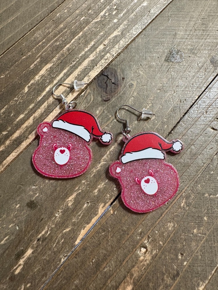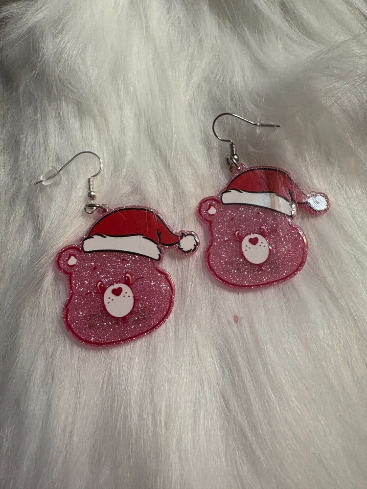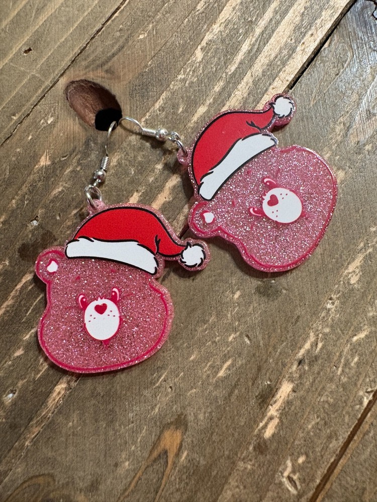 Description Holidays are meant to be accessorized! Pink Care Bear Holiday Earrings feature a pink Care Bear's face that is wearing a surprised look and a red Santa hat. The bodies of the earrings are filled with glitter that shines in the light. Pair these earrings with a pink sweater for an eye-catching look! Details Dimensions: 1.39" x 1.5" Type: Ear Wire Material: Acrylic & Metal Color: Pink, Red & White Metal Color: Silver Features One of a kind, fashion jewelry, everyday jewelry Great gift for that special girl, anniversary gift, birthday gift or gift to say how much you care. Check out the rest of our store for other great products!Fast Shipping Satisfaction Guaranteed Your source for great products shipped in a pink box with a thank you gift and discount coupon shipped from Pocatello ID Questions/Feedback Don't forget to leave feedback