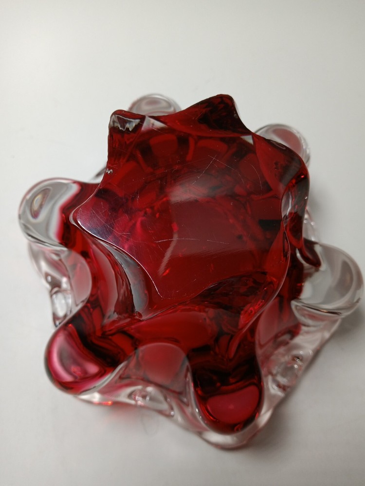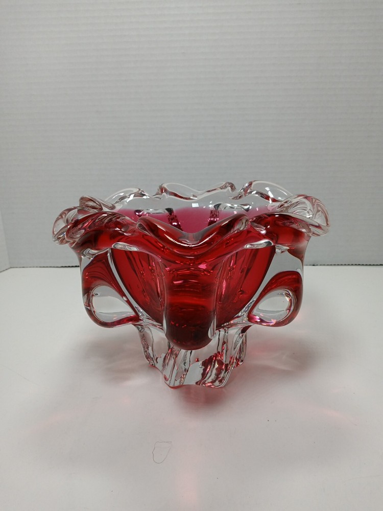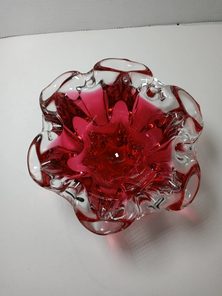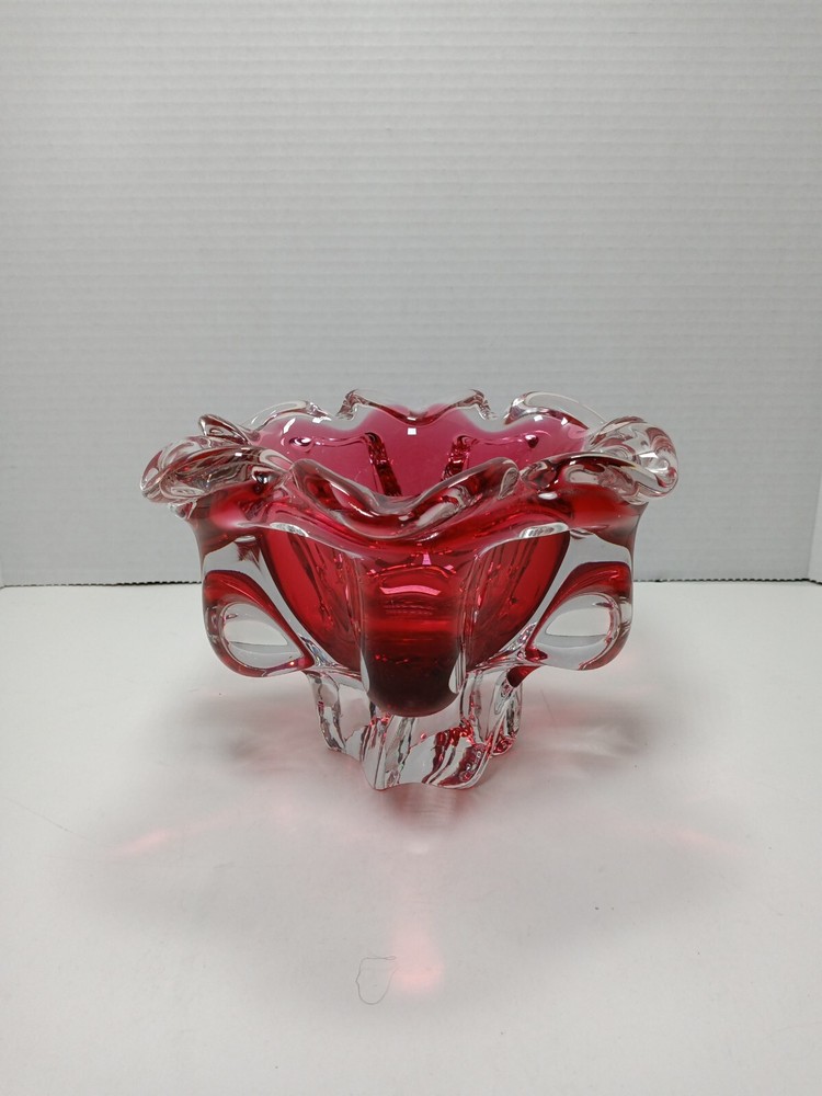 This Pink Cranberry Art Glass Lead Crystal Footed Bowl is a stunning piece of abstract glass art from approximately the 1970s. The bowl features a vibrant red and clear color palette, making it perfect for any occasion. Made of high-quality lead crystal glass with a glossy finish it is sure to add a touch of elegance to any collection or kitchen decor. The unique shape and pattern of this bowl make it a standout piece for collectors of art glass or those who appreciate intricate and whimsical designs. Approximately 5" T. x 7.25 W. and weighs 4lbs, 5.25 oz.